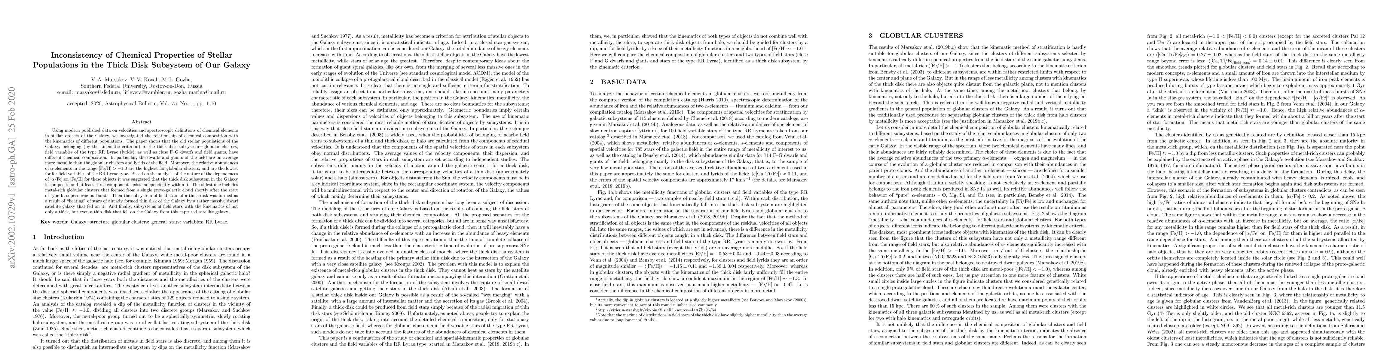 Using modern published data on velocities and spectroscopic definitions of chemical elements in stellar objects of the Galaxy, we investigated the relationship of chemical composition with the kinematics of different populations. The paper shows that the old stellar populations of the Galaxy, belonging (by the kinematic criterion) to the thick disk subsystem---globular clusters, field variables of the type RR Lyrae (lyrids), as well as close F--G dwarfs and field giants, have different chemical composition. In particular, the dwarfs and giants of the field are on average more metallic than the globular clusters and lyrids of the field. Moreover, the relative abundances of $\alpha$-elements in the range $\rm{[Fe/H]} > -1.0$ are the highest for globular clusters, and are the lowest for for field variables of the RR Lyrae type. Based on the analysis of the nature of the dependences of [$\alpha$/Fe] on [Fe/H] for these objects it was suggested that the thick disk subsystem in the Galaxy is composite and at least three components exist independently within it. The oldest one includes metal-rich globular clusters that formed from a single proto-galactic cloud shortly after the start of type Ia supernovae outbursts. Then the subsystem of field stars of a thick disk was formed as a result of ``heating'' of stars of already formed thin disk of the Galaxy by a rather massive dwarf satellite galaxy that fell on it. And finally, subsystems of field stars with the kinematics of not only a thick, but even a thin disk that fell on the Galaxy from this captured satellite galaxy.