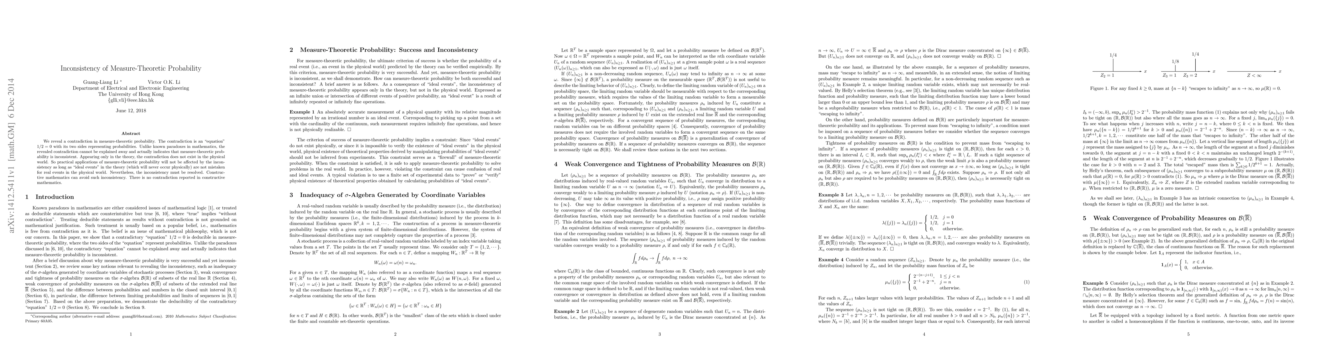 Title: Inconsistency of Measure-Theoretic Probability Summary: The paper identifies a contradiction in measure-theory, specifically $1/2 = 0$, indicating fundamental inconsistency; however, practical applications remain unaffected as the contradiction pertains only to theoretical "ideal events." Constructive mathematics is noted to avoid such issues.