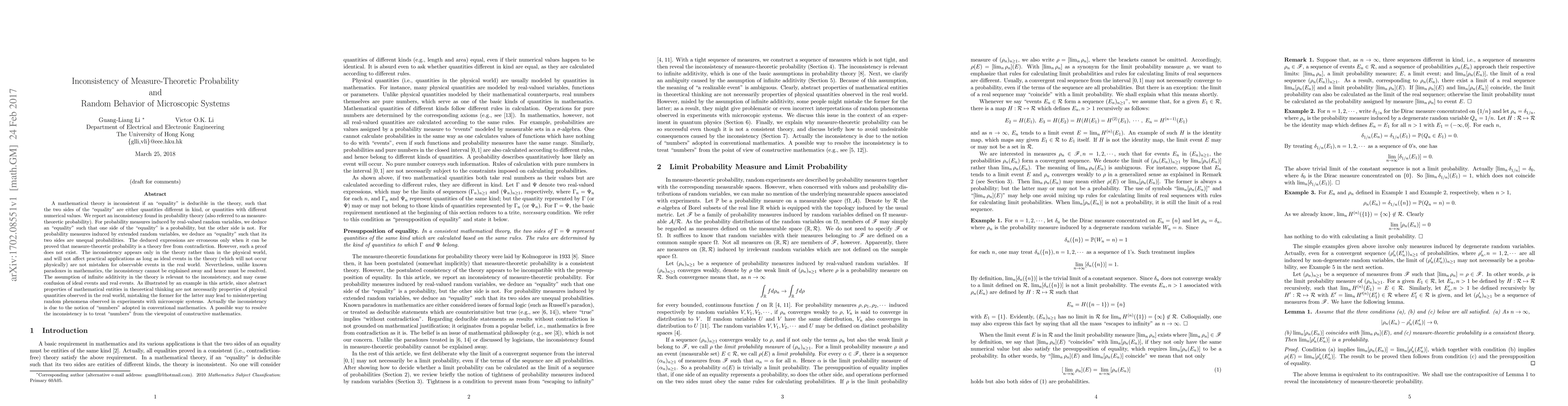 We report an inconsistency found in probability theory (also referred to as measure-theoretic probability). For probability measures induced by real-valued random variables, we deduce an "equality" such that one side of the "equality" is a probability, but the other side is not. For probability measures induced by extended random variables, we deduce an "equality" such that its two sides are unequal probabilities. The deduced expressions are erroneous only when it can be proved that measure-theoretic probability is a theory free from contradiction. However, such a proof does not exist. The inconsistency appears only in the theory rather than in the physical world, and will not affect practical applications as long as ideal events in the theory (which will not occur physically) are not mistaken for observable events in the real world. Nevertheless, unlike known paradoxes in mathematics, the inconsistency cannot be explained away and hence must be resolved. The assumption of infinite additivity in the theory is relevant to the inconsistency, and may cause confusion of ideal events and real events. As illustrated by an example in this article, since abstract properties of mathematical entities in theoretical thinking are not necessarily properties of physical quantities observed in the real world, mistaking the former for the latter may lead to misinterpreting random phenomena observed in experiments with microscopic systems. Actually the inconsistency is due to the notion of "numbers" adopted in conventional mathematics. A possible way to resolve the inconsistency is to treat "numbers" from the viewpoint of constructive mathematics.