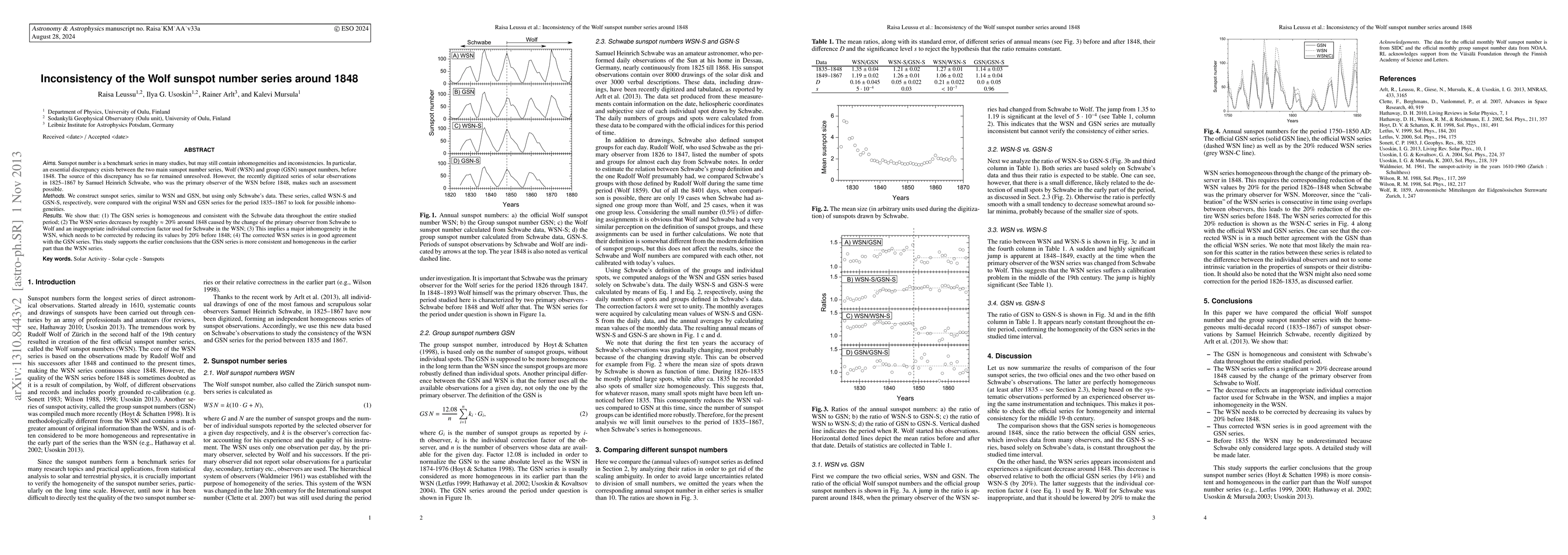 Researchers analyzed sunspot number series from 1825-1867 to find inconsistencies with the Wolf (WSN) series around 1848; they found that WSN decreased by 20% due to a primary observer change and correction error, leading to corrected agreement with another series.
