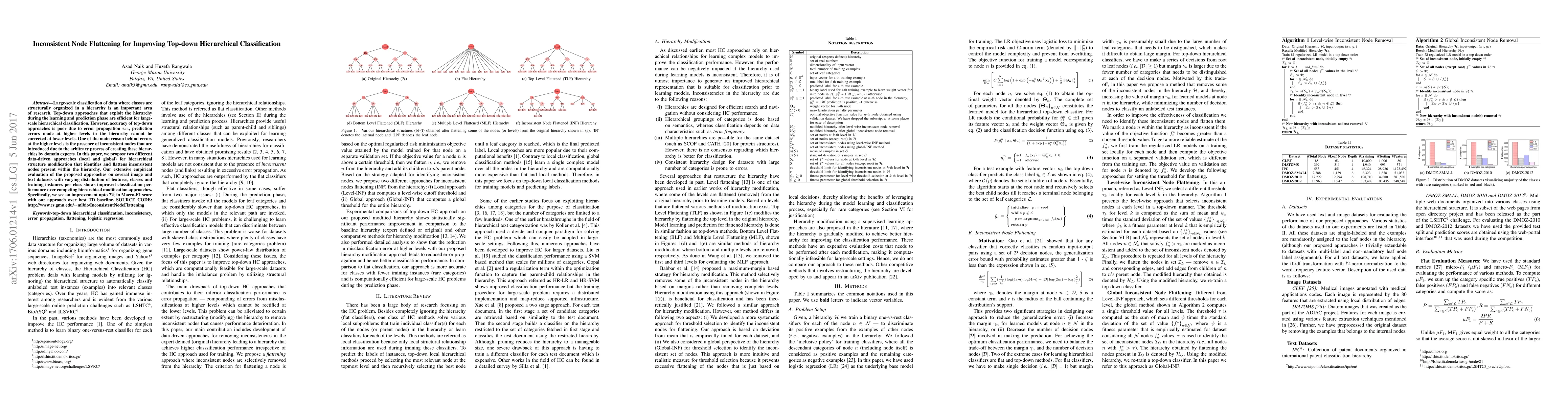 Large-scale classification of data where classes are structurally organized in a hierarchy is an important area of research. Top-down approaches that exploit the hierarchy during the learning and prediction phase are efficient for large scale hierarchical classification. However, accuracy of top-down approaches is poor due to error propagation i.e., prediction errors made at higher levels in the hierarchy cannot be corrected at lower levels. One of the main reason behind errors at the higher levels is the presence of inconsistent nodes that are introduced due to the arbitrary process of creating these hierarchies by domain experts. In this paper, we propose two different data-driven approaches (local and global) for hierarchical structure modification that identifies and flattens inconsistent nodes present within the hierarchy. Our extensive empirical evaluation of the proposed approaches on several image and text datasets with varying distribution of features, classes and training instances per class shows improved classification performance over competing hierarchical modification approaches. Specifically, we see an improvement upto 7% in Macro-F1 score with our approach over best TD baseline. SOURCE CODE: http://www.cs.gmu.edu/~mlbio/InconsistentNodeFlattening