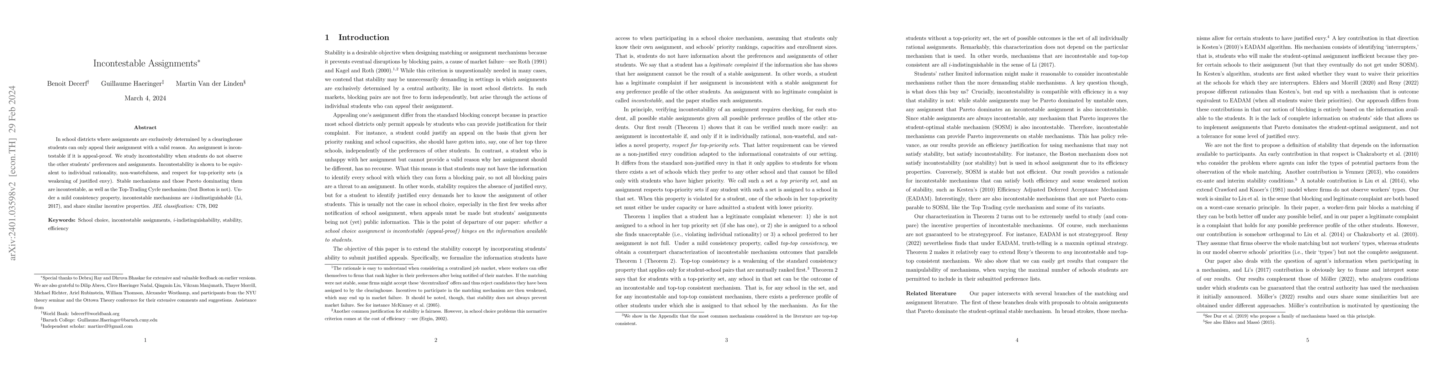 This paper explores incontestability in school district assignment mechanisms where students can only appeal assignments for valid reasons. It establishes that incontestability equates to individual rationality, non-wastefulness, and respect for top-priority sets, and identifies stable mechanisms as incontestable.
