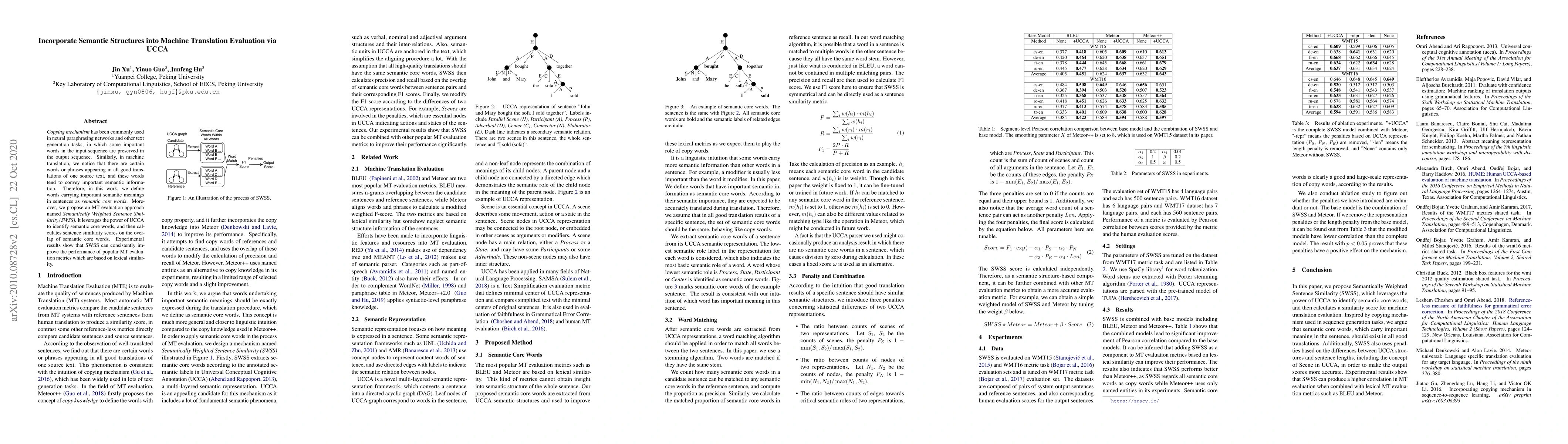 This paper proposes a new machine translation evaluation method called Semantically Weighted Sentence Similarity (SWSS), which identifies important semantic core words using UCCA and calculates sentence similarity based on the overlap of these core words. Experimental results demonstrate that SWSS enhances the performance of existing lexical similarity-based evaluation metrics.