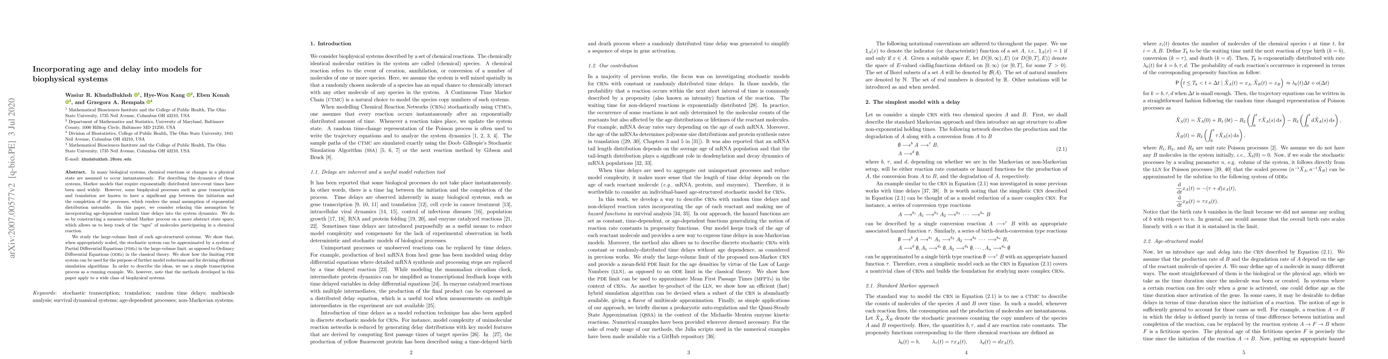 In many biological systems, chemical reactions or changes in a physical state are assumed to occur instantaneously. For describing the dynamics of those systems, Markov models that require exponentially distributed inter-event times have been used widely. However, some biophysical processes such as gene transcription and translation are known to have a significant gap between the initiation and the completion of the processes, which renders the usual assumption of exponential distribution untenable. In this paper, we consider relaxing this assumption by incorporating age-dependent random time delays into the system dynamics. We do so by constructing a measure-valued Markov process on a more abstract state space, which allows us to keep track of the "ages" of molecules participating in a chemical reaction. We study the large-volume limit of such age-structured systems. We show that, when appropriately scaled, the stochastic system can be approximated by a system of Partial Differential Equations (PDEs) in the large-volume limit, as opposed to Ordinary Differential Equations (ODEs) in the classical theory. We show how the limiting PDE system can be used for the purpose of further model reductions and for devising efficient simulation algorithms. In order to describe the ideas, we use a simple transcription process as a running example. We, however, note that the methods developed in this paper apply to a wide class of biophysical systems.