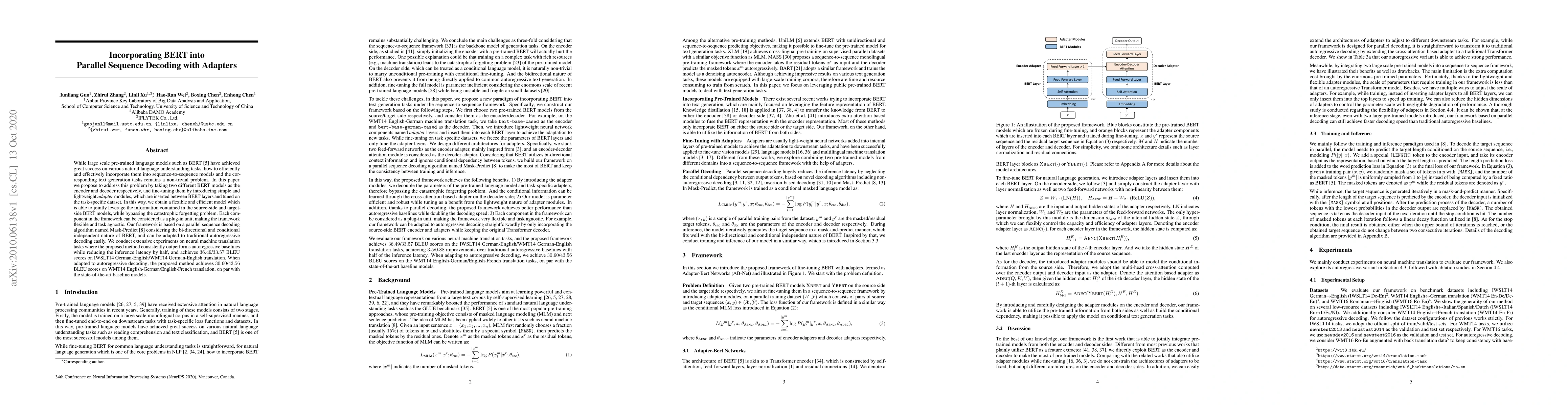 This paper proposes a method to efficiently incorporate BERT into parallel sequence decoding using lightweight adapter modules, which enhances performance in neural machine translation tasks while reducing inference latency. The framework, based on Mask-Predict, outperforms autoregressive baselines and achieves competitive BLEU scores.