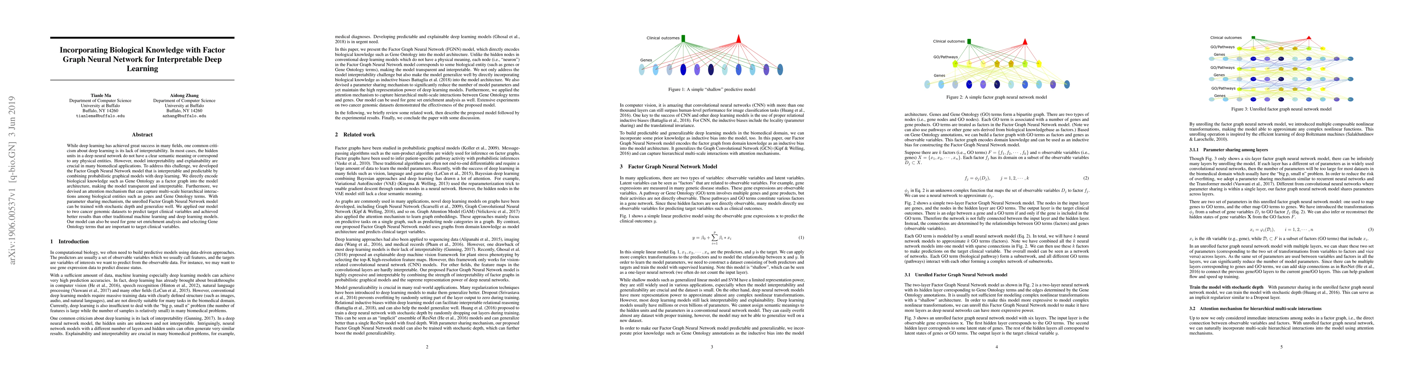 While deep learning has achieved great success in many fields, one common criticism about deep learning is its lack of interpretability. In most cases, the hidden units in a deep neural network do not have a clear semantic meaning or correspond to any physical entities. However, model interpretability and explainability are crucial in many biomedical applications. To address this challenge, we developed the Factor Graph Neural Network model that is interpretable and predictable by combining probabilistic graphical models with deep learning. We directly encode biological knowledge such as Gene Ontology as a factor graph into the model architecture, making the model transparent and interpretable. Furthermore, we devised an attention mechanism that can capture multi-scale hierarchical interactions among biological entities such as genes and Gene Ontology terms. With parameter sharing mechanism, the unrolled Factor Graph Neural Network model can be trained with stochastic depth and generalize well. We applied our model to two cancer genomic datasets to predict target clinical variables and achieved better results than other traditional machine learning and deep learning models. Our model can also be used for gene set enrichment analysis and selecting Gene Ontology terms that are important to target clinical variables.