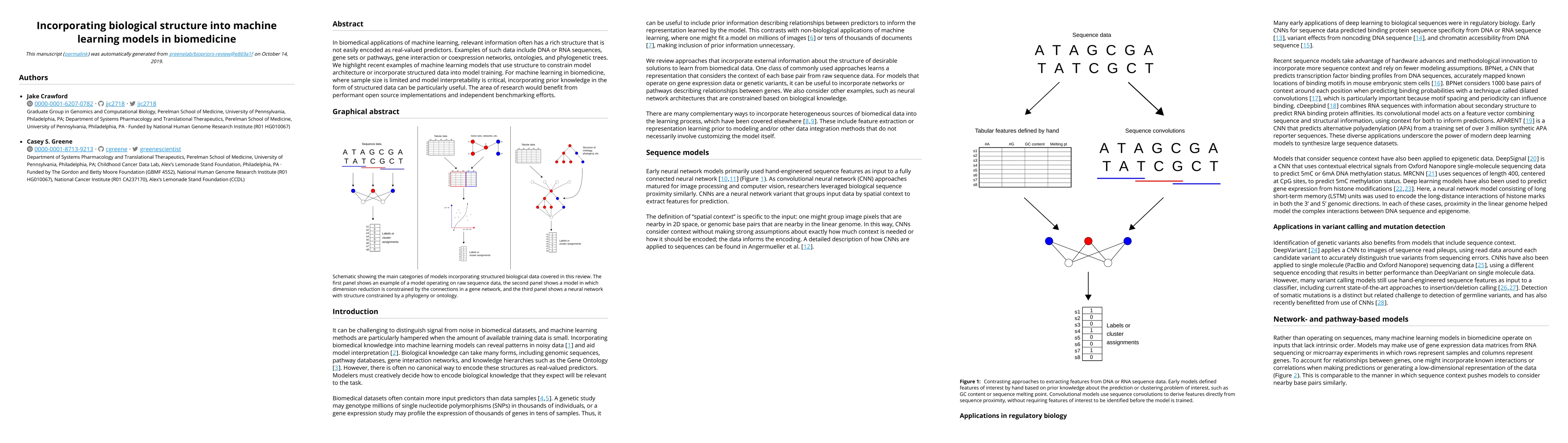 In biomedical applications of machine learning, relevant information often has a rich structure that is not easily encoded as real-valued predictors. Examples of such data include DNA or RNA sequences, gene sets or pathways, gene interaction or coexpression networks, ontologies, and phylogenetic trees. We highlight recent examples of machine learning models that use structure to constrain model architecture or incorporate structured data into model training. For machine learning in biomedicine, where sample size is limited and model interpretability is critical, incorporating prior knowledge in the form of structured data can be particularly useful. The area of research would benefit from performant open source implementations and independent benchmarking efforts.
