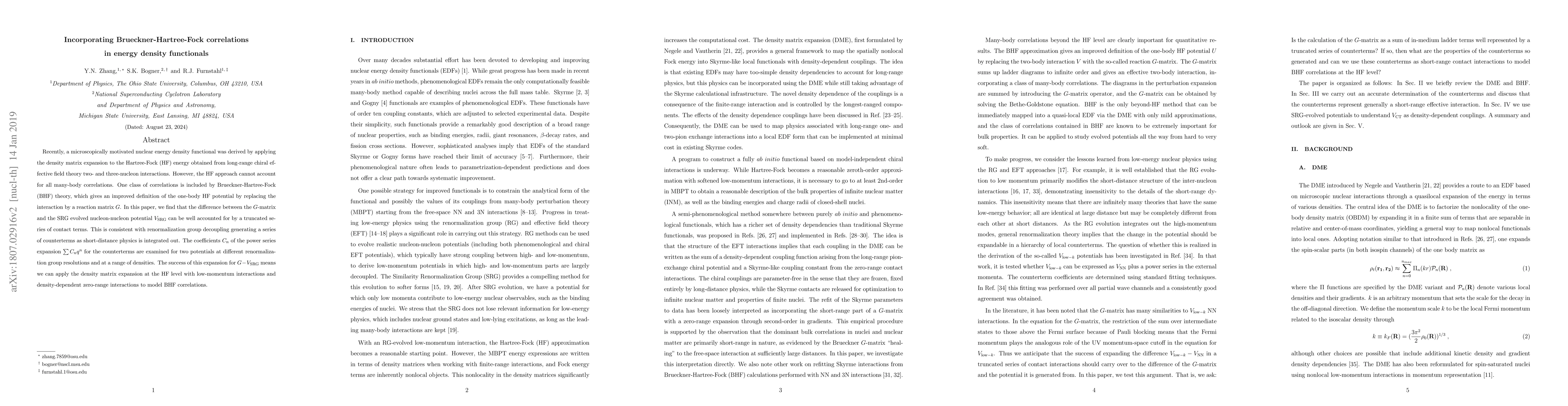 This paper explores incorporating Brueckner-Hartree-Fock (BHF) correlations into the Density Matrix Expansion approach by showing that the difference between the BHF reaction matrix $G$ and the nucleon-nucleon potential $V_{\mathrm{NN}}$ can be modeled using a truncated series of contact terms. This approach allows for the effective modeling of BHF correlations using low-momentum interactions and density-dependent zero-range interactions.