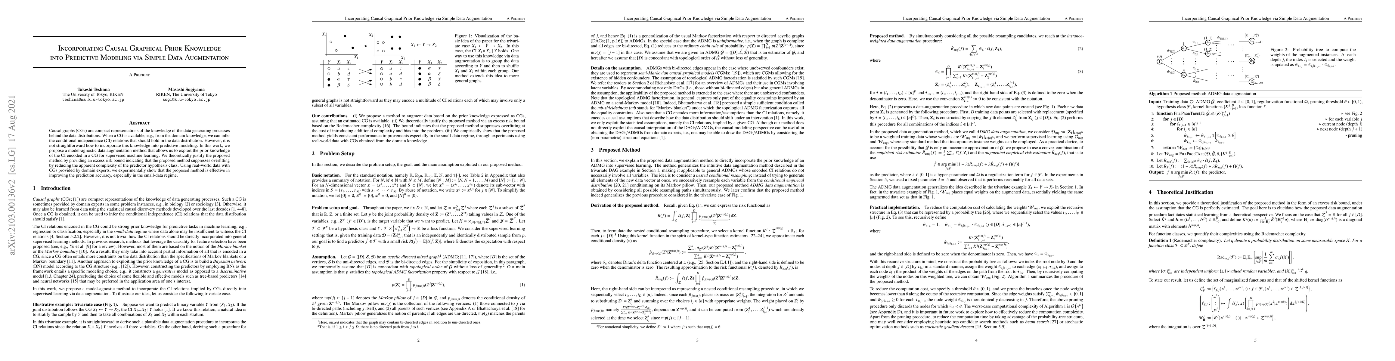 This paper proposes a model-agnostic data augmentation technique to incorporate causal graphical prior knowledge into predictive modeling, improving accuracy, especially with limited data. The method leverages conditional independence relations encoded in causal graphs to reduce overfitting and enhance model performance.
