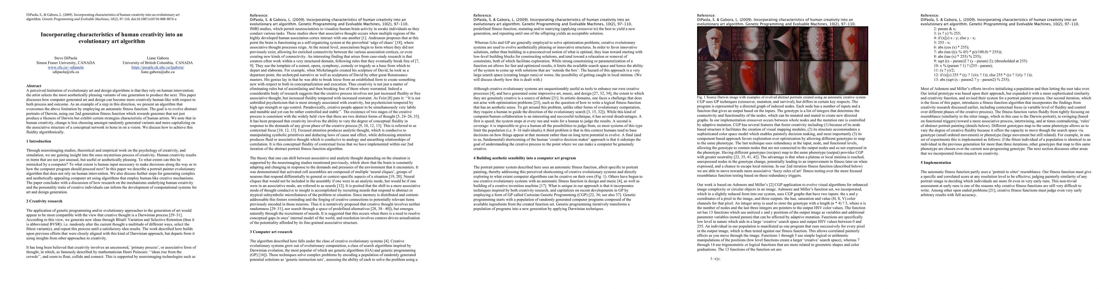 A perceived limitation of evolutionary art and design algorithms is that they rely on human intervention; the artist selects the most aesthetically pleasing variants of one generation to produce the next. This paper discusses how computer generated art and design can become more creatively human-like with respect to both process and outcome. As an example of a step in this direction, we present an algorithm that overcomes the above limitation by employing an automatic fitness function. The goal is to evolve abstract portraits of Darwin, using our 2nd generation fitness function which rewards genomes that not just produce a likeness of Darwin but exhibit certain strategies characteristic of human artists. We note that in human creativity, change is less choosing amongst randomly generated variants and more capitalizing on the associative structure of a conceptual network to hone in on a vision. We discuss how to achieve this fluidity algorithmically.
