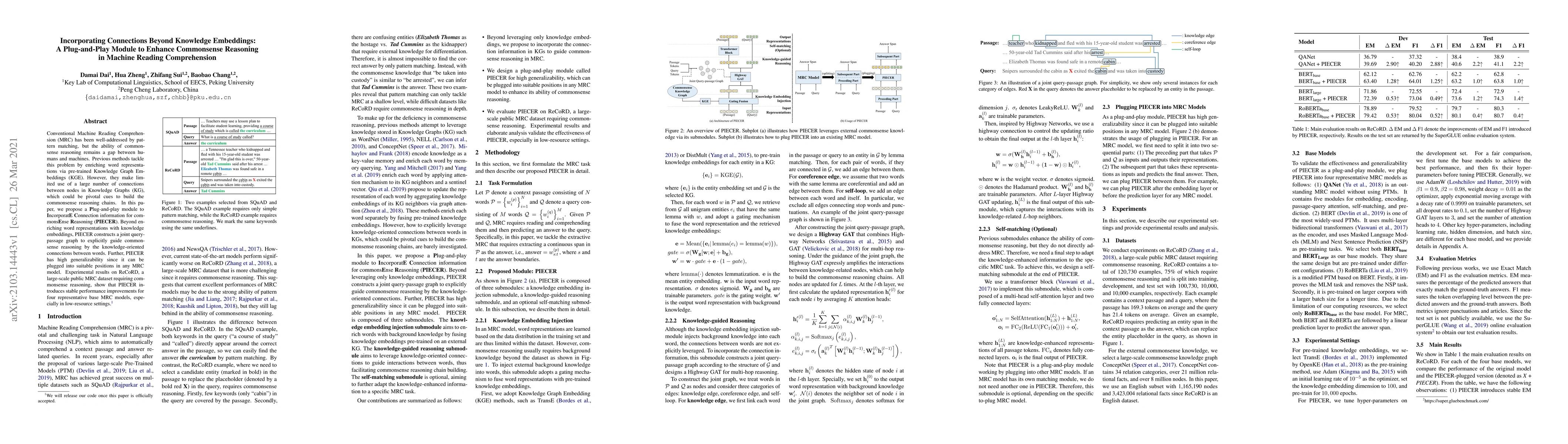 Conventional Machine Reading Comprehension (MRC) has been well-addressed by pattern matching, but the ability of commonsense reasoning remains a gap between humans and machines. Previous methods tackle this problem by enriching word representations via pre-trained Knowledge Graph Embeddings (KGE). However, they make limited use of a large number of connections between nodes in Knowledge Graphs (KG), which could be pivotal cues to build the commonsense reasoning chains. In this paper, we propose a Plug-and-play module to IncorporatE Connection information for commonsEnse Reasoning (PIECER). Beyond enriching word representations with knowledge embeddings, PIECER constructs a joint query-passage graph to explicitly guide commonsense reasoning by the knowledge-oriented connections between words. Further, PIECER has high generalizability since it can be plugged into suitable positions in any MRC model. Experimental results on ReCoRD, a large-scale public MRC dataset requiring commonsense reasoning, show that PIECER introduces stable performance improvements for four representative base MRC models, especially in low-resource settings.