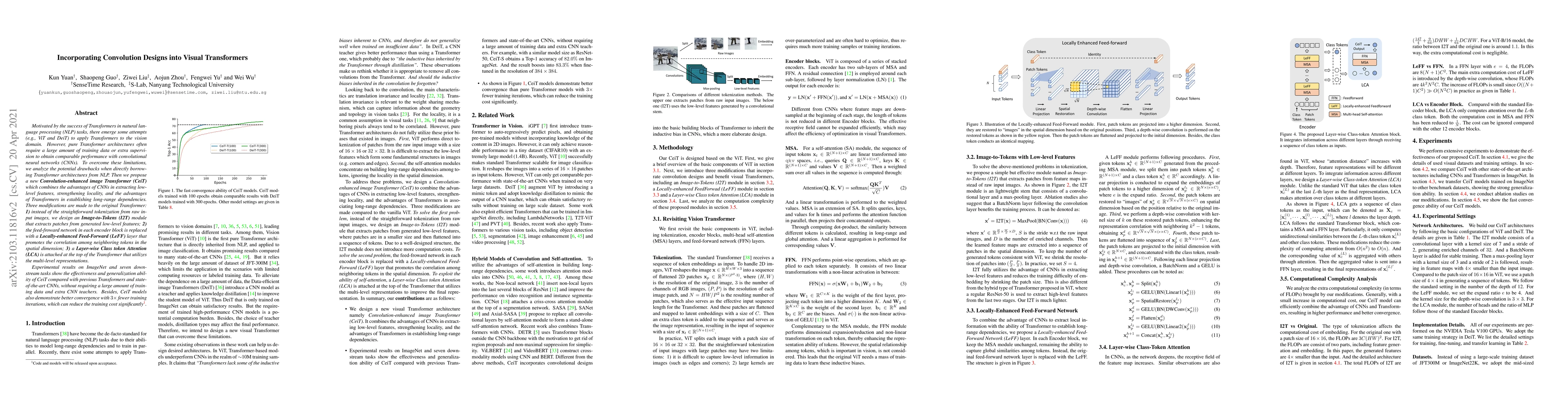 Motivated by the success of Transformers in natural language processing (NLP) tasks, there emerge some attempts (e.g., ViT and DeiT) to apply Transformers to the vision domain. However, pure Transformer architectures often require a large amount of training data or extra supervision to obtain comparable performance with convolutional neural networks (CNNs). To overcome these limitations, we analyze the potential drawbacks when directly borrowing Transformer architectures from NLP. Then we propose a new \textbf{Convolution-enhanced image Transformer (CeiT)} which combines the advantages of CNNs in extracting low-level features, strengthening locality, and the advantages of Transformers in establishing long-range dependencies. Three modifications are made to the original Transformer: \textbf{1)} instead of the straightforward tokenization from raw input images, we design an \textbf{Image-to-Tokens (I2T)} module that extracts patches from generated low-level features; \textbf{2)} the feed-froward network in each encoder block is replaced with a \textbf{Locally-enhanced Feed-Forward (LeFF)} layer that promotes the correlation among neighboring tokens in the spatial dimension; \textbf{3)} a \textbf{Layer-wise Class token Attention (LCA)} is attached at the top of the Transformer that utilizes the multi-level representations. Experimental results on ImageNet and seven downstream tasks show the effectiveness and generalization ability of CeiT compared with previous Transformers and state-of-the-art CNNs, without requiring a large amount of training data and extra CNN teachers. Besides, CeiT models also demonstrate better convergence with $3\times$ fewer training iterations, which can reduce the training cost significantly\footnote{Code and models will be released upon acceptance.}.