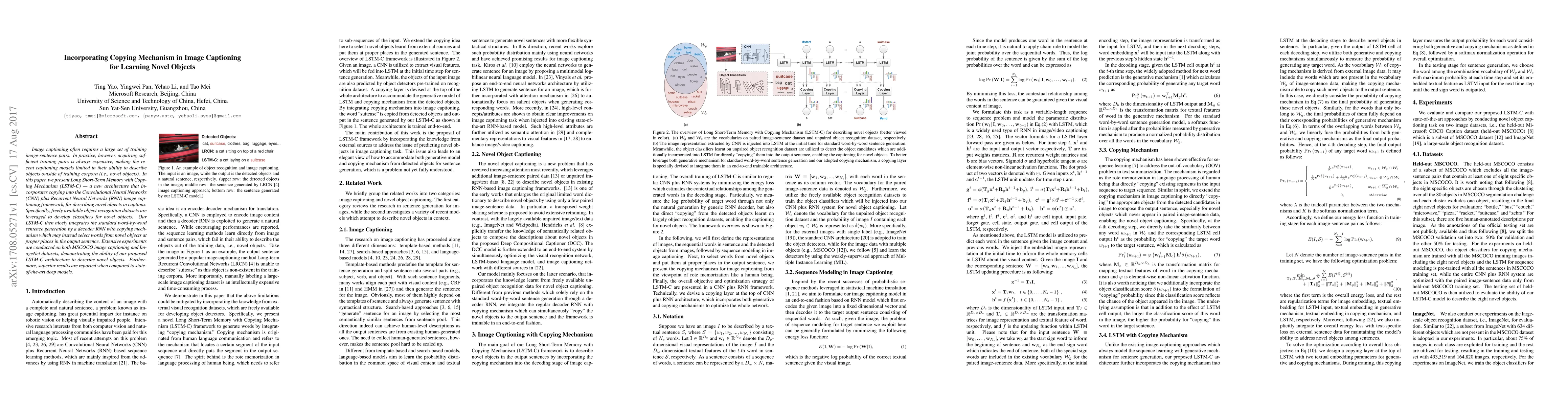 Image captioning often requires a large set of training image-sentence pairs. In practice, however, acquiring sufficient training pairs is always expensive, making the recent captioning models limited in their ability to describe objects outside of training corpora (i.e., novel objects). In this paper, we present Long Short-Term Memory with Copying Mechanism (LSTM-C) --- a new architecture that incorporates copying into the Convolutional Neural Networks (CNN) plus Recurrent Neural Networks (RNN) image captioning framework, for describing novel objects in captions. Specifically, freely available object recognition datasets are leveraged to develop classifiers for novel objects. Our LSTM-C then nicely integrates the standard word-by-word sentence generation by a decoder RNN with copying mechanism which may instead select words from novel objects at proper places in the output sentence. Extensive experiments are conducted on both MSCOCO image captioning and ImageNet datasets, demonstrating the ability of our proposed LSTM-C architecture to describe novel objects. Furthermore, superior results are reported when compared to state-of-the-art deep models.