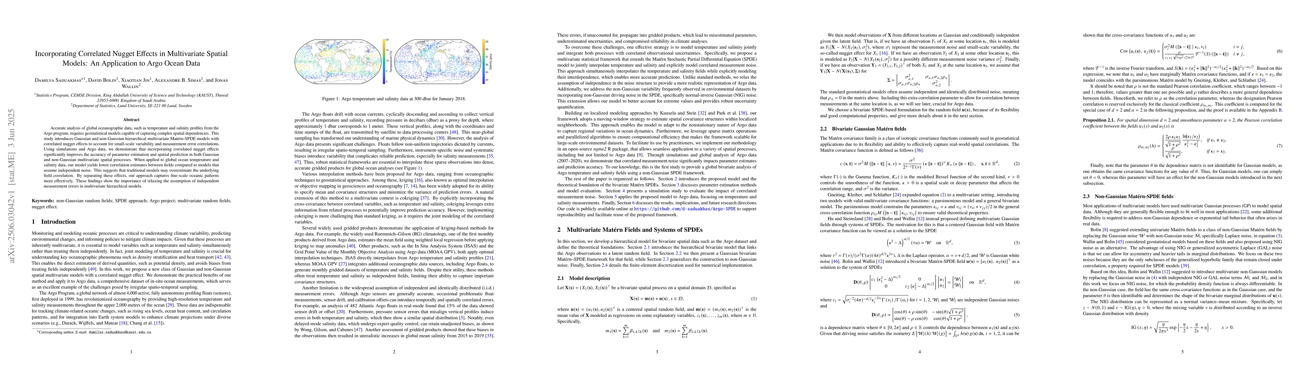 The study introduces Gaussian and non-Gaussian hierarchical multivariate Mat'ern-SPDE models with correlated nugget effects for analyzing complex spatial dependencies in Argo ocean data.