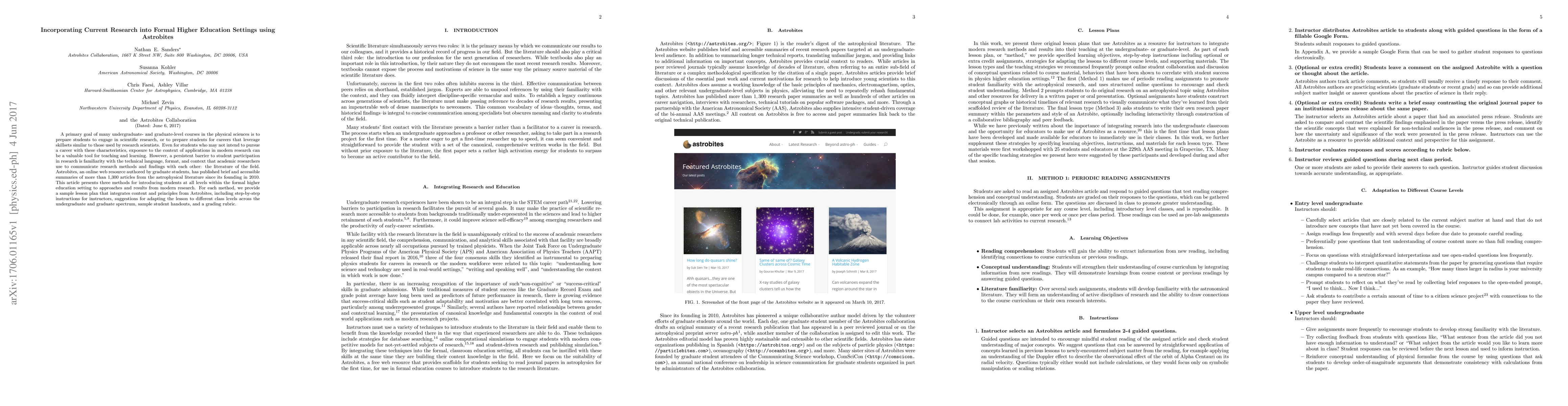 This paper explores integrating current astrophysical research into formal higher education through Astrobites, offering accessible summaries of academic articles. It presents three methods for introducing students to modern research, complete with lesson plans, adaptations for different levels, and student handouts.
