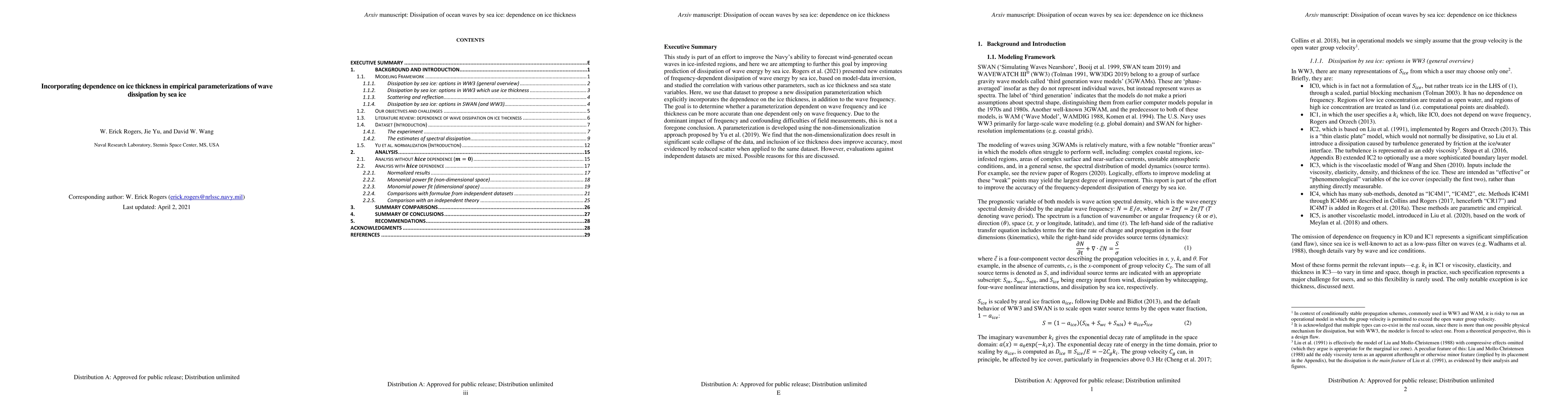 This study proposes a new parameterization for wave dissipation by sea ice that explicitly incorporates ice thickness, in addition to wave frequency, to improve wave forecasting in ice-infested regions. The new model shows reduced data scatter and improved accuracy but has mixed results when evaluated with independent datasets, highlighting the challenges of field measurements and the complexity of the relationship.