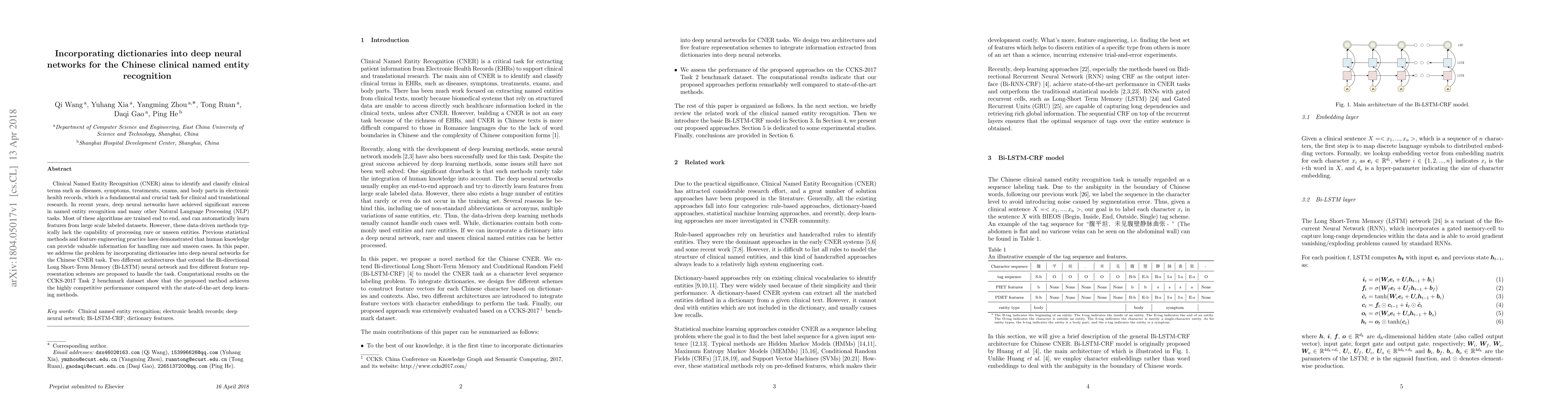 This paper proposes integrating dictionaries into deep neural networks to enhance Chinese Clinical Named Entity Recognition (CNER) performance, particularly for rare entities. The study introduces two Bi-LSTM architectures and five feature schemes, achieving competitive results on the CCKS-2017 Task 2 dataset compared to existing deep learning methods.