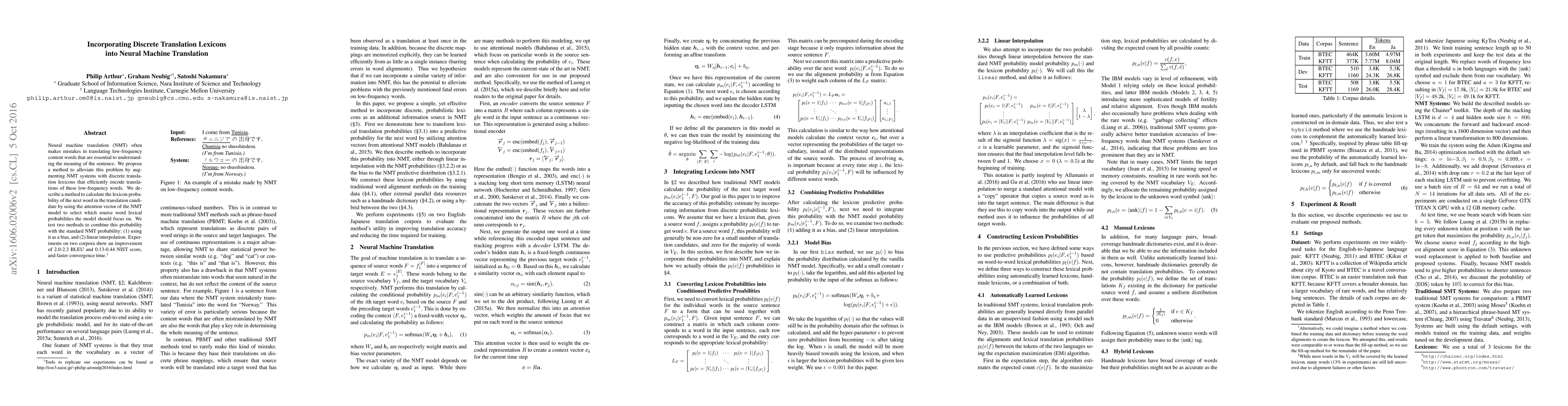 This paper proposes augmenting neural machine translation (NMT) systems with discrete translation lexicons to better handle low-frequency content words. It introduces methods to incorporate lexicon probabilities to improve translation accuracy and faster convergence, showing improvements in BLEU and NIST scores.