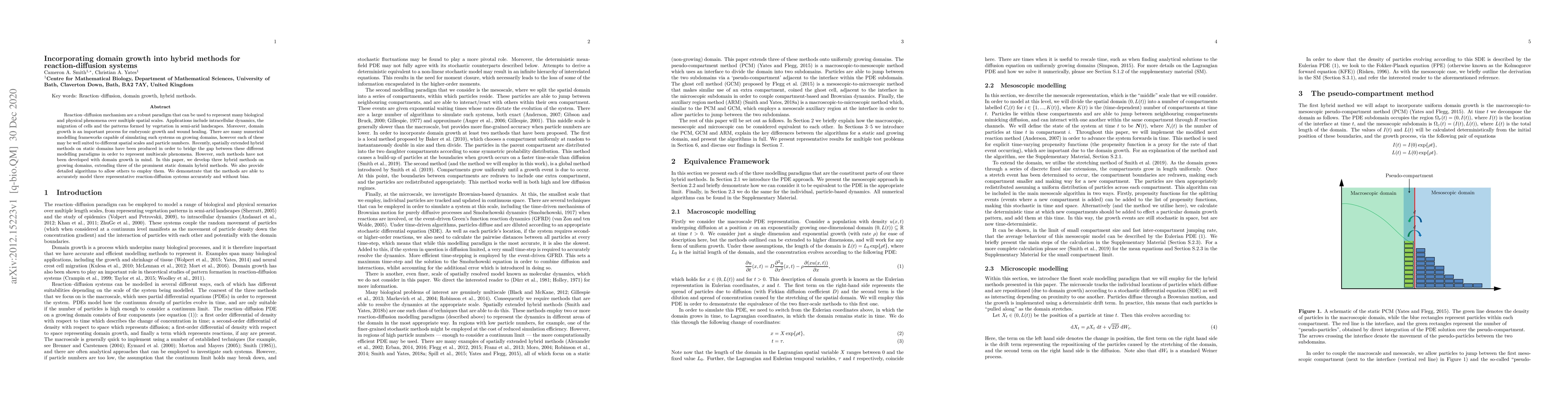 This paper introduces three hybrid methods for simulating reaction-diffusion systems on growing domains, extending existing static domain methods. These new methods accurately model representative systems without bias, bridging the gap between different modeling paradigms for multiscale phenomena.