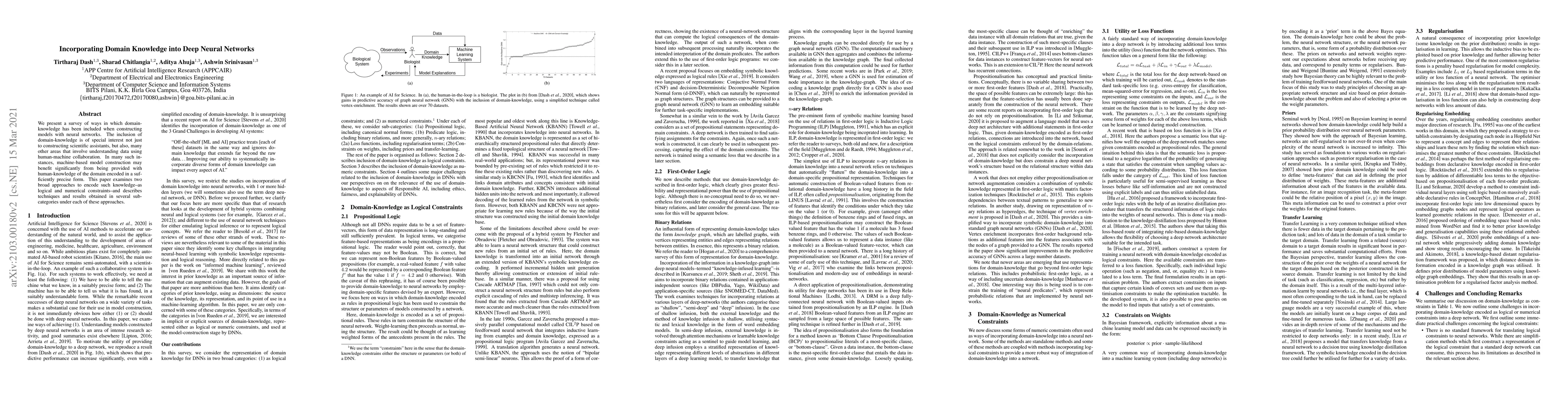 We present a survey of ways in which domain-knowledge has been included when constructing models with neural networks. The inclusion of domain-knowledge is of special interest not just to constructing scientific assistants, but also, many other areas that involve understanding data using human-machine collaboration. In many such instances, machine-based model construction may benefit significantly from being provided with human-knowledge of the domain encoded in a sufficiently precise form. This paper examines two broad approaches to encode such knowledge--as logical and numerical constraints--and describes techniques and results obtained in several sub-categories under each of these approaches.
