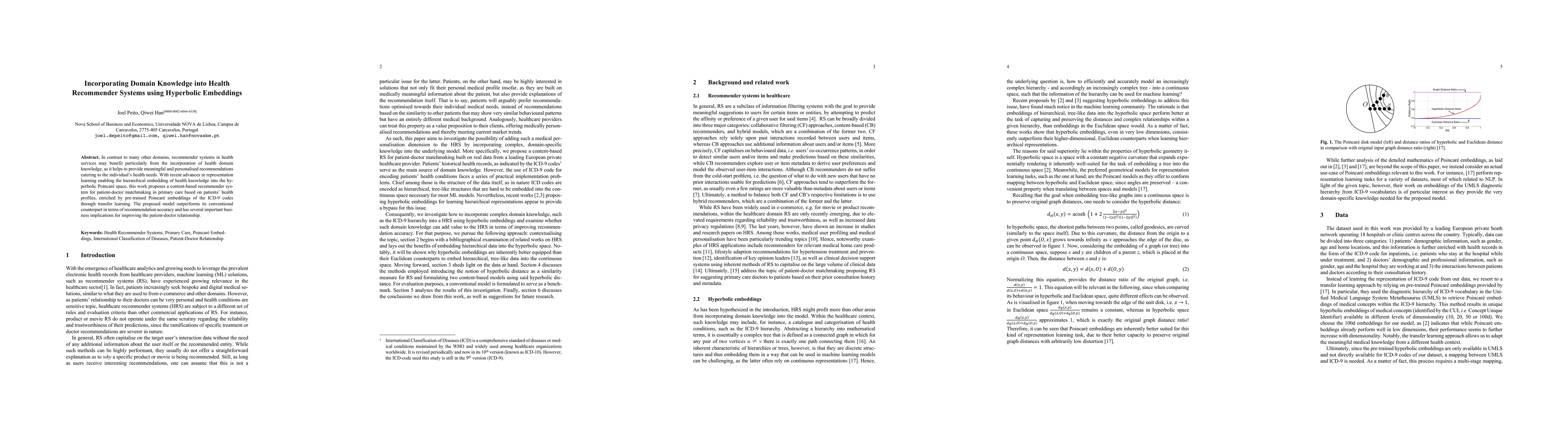 This paper proposes a health recommender system using hyperbolic embeddings to incorporate domain knowledge, enhancing patient-doctor matchmaking in primary care. The model, enriched with pre-trained Poincare embeddings of ICD-9 codes, outperforms conventional methods in recommendation accuracy and has significant implications for improving patient-doctor relationships.