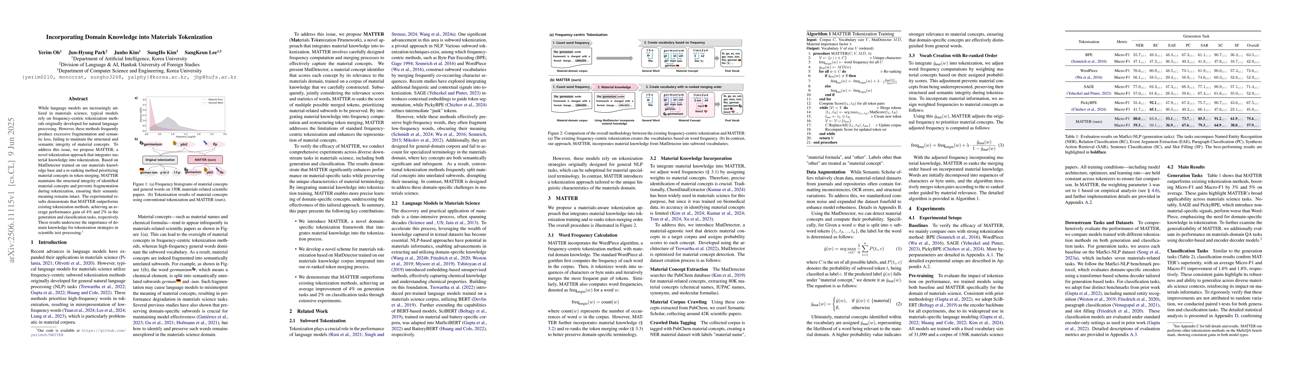 While language models are increasingly utilized in materials science, typical models rely on frequency-centric tokenization methods originally developed for natural language processing. However, these methods frequently produce excessive fragmentation and semantic loss, failing to maintain the structural and semantic integrity of material concepts. To address this issue, we propose MATTER, a novel tokenization approach that integrates material knowledge into tokenization. Based on MatDetector trained on our materials knowledge base and a re-ranking method prioritizing material concepts in token merging, MATTER maintains the structural integrity of identified material concepts and prevents fragmentation during tokenization, ensuring their semantic meaning remains intact. The experimental results demonstrate that MATTER outperforms existing tokenization methods, achieving an average performance gain of $4\%$ and $2\%$ in the generation and classification tasks, respectively. These results underscore the importance of domain knowledge for tokenization strategies in scientific text processing. Our code is available at https://github.com/yerimoh/MATTER