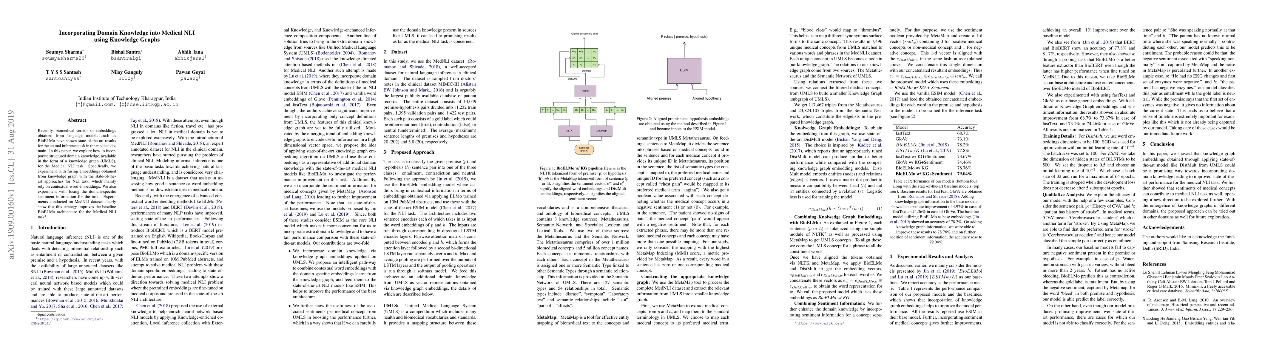 Recently, biomedical version of embeddings obtained from language models such as BioELMo have shown state-of-the-art results for the textual inference task in the medical domain. In this paper, we explore how to incorporate structured domain knowledge, available in the form of a knowledge graph (UMLS), for the Medical NLI task. Specifically, we experiment with fusing embeddings obtained from knowledge graph with the state-of-the-art approaches for NLI task (ESIM model). We also experiment with fusing the domain-specific sentiment information for the task. Experiments conducted on MedNLI dataset clearly show that this strategy improves the baseline BioELMo architecture for the Medical NLI task.