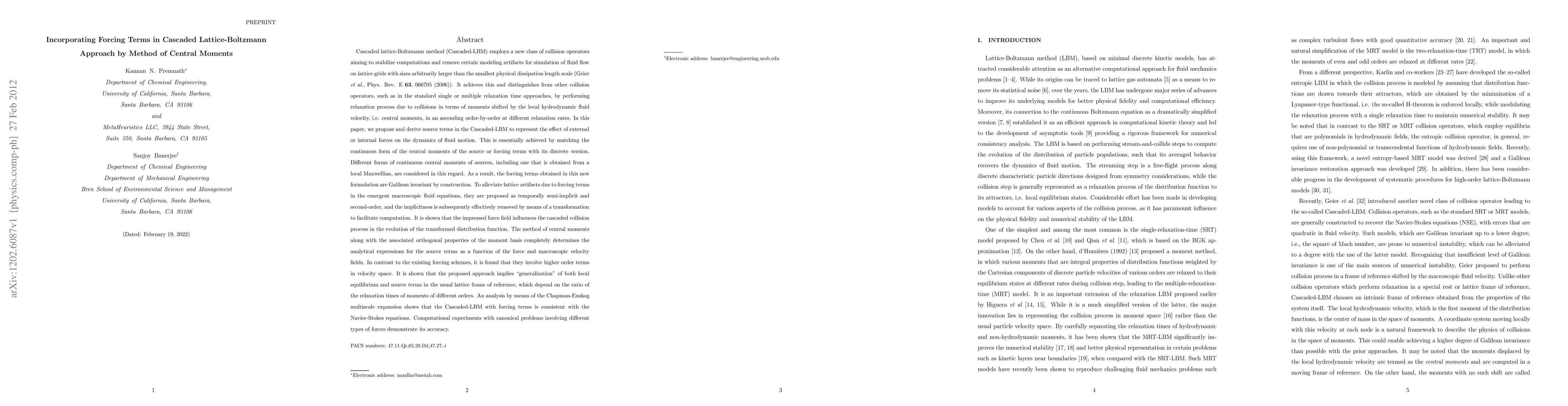 This paper proposes a method to incorporate forcing terms in the Cascaded Lattice-Boltzmann Approach (Cascaded-LBM) using the method of central moments, ensuring Galilean invariance. The derived source terms match continuous and discrete central moments, enhancing numerical stability and consistency with the Navier-Stokes equations.