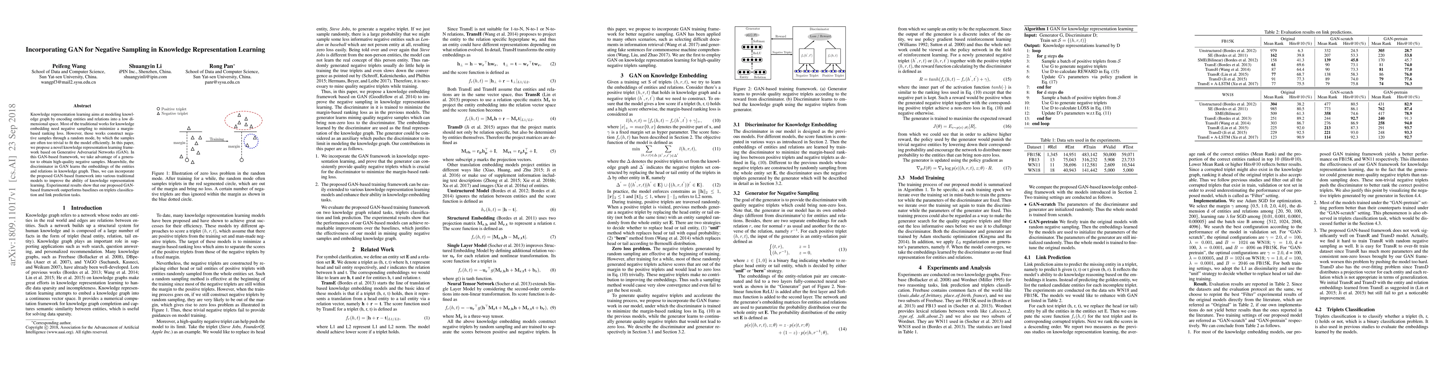 This paper proposes a novel knowledge representation framework using Generative Adversarial Networks (GAN) to generate high-quality negative samples, enhancing traditional models. The GAN framework improves triplets classification and link prediction tasks, outperforming baseline methods.