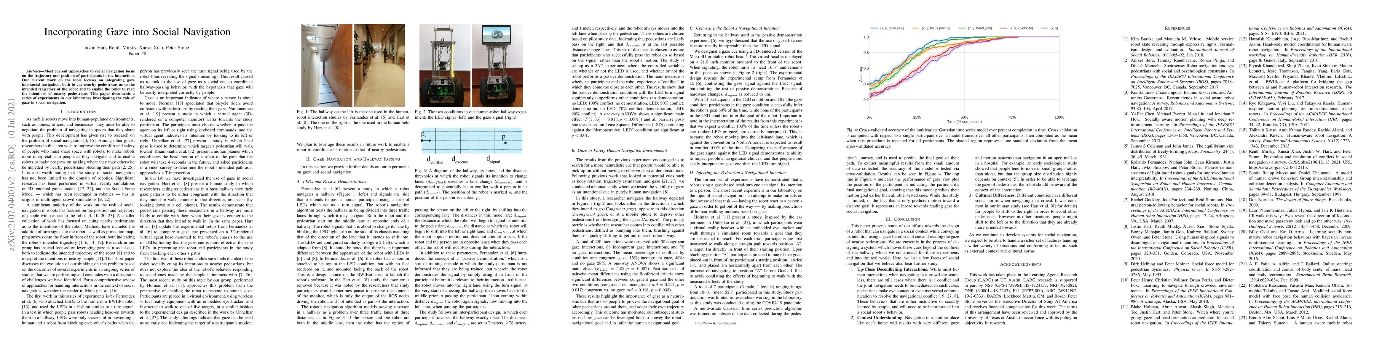 This paper explores integrating gaze into social navigation to enhance communication between robots and pedestrians, using experiments to investigate how gaze cues can inform both robot trajectory and pedestrian intentions.