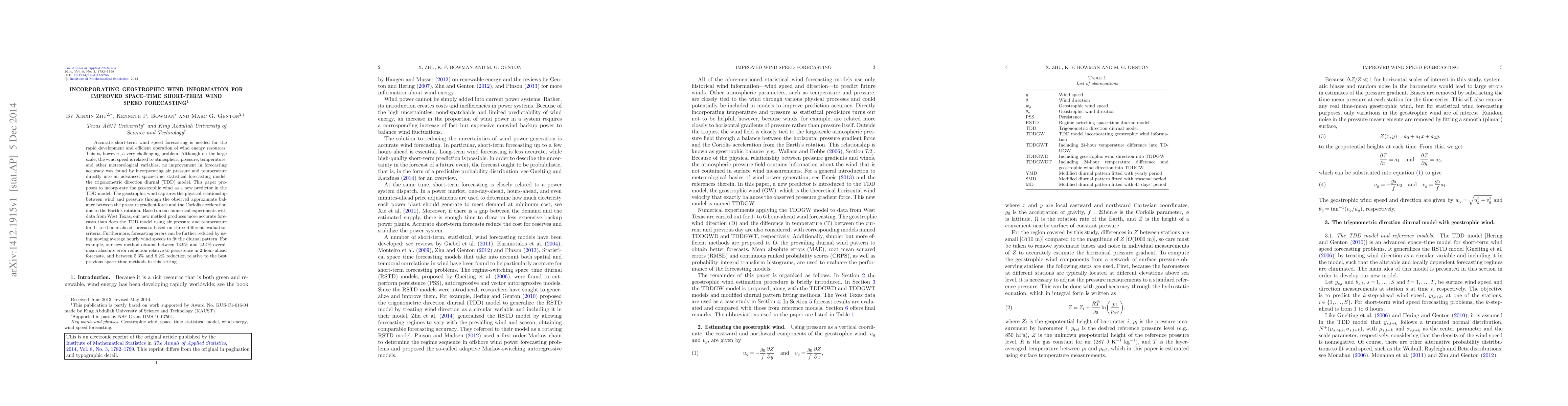 This paper proposes incorporating geostrophic wind into the TDD model to improve short-term wind speed forecasting, achieving up to 22.4% reduction in mean absolute error compared to persistence and 8.2% compared to previous methods, demonstrating the effectiveness of geostrophic wind as a predictor.