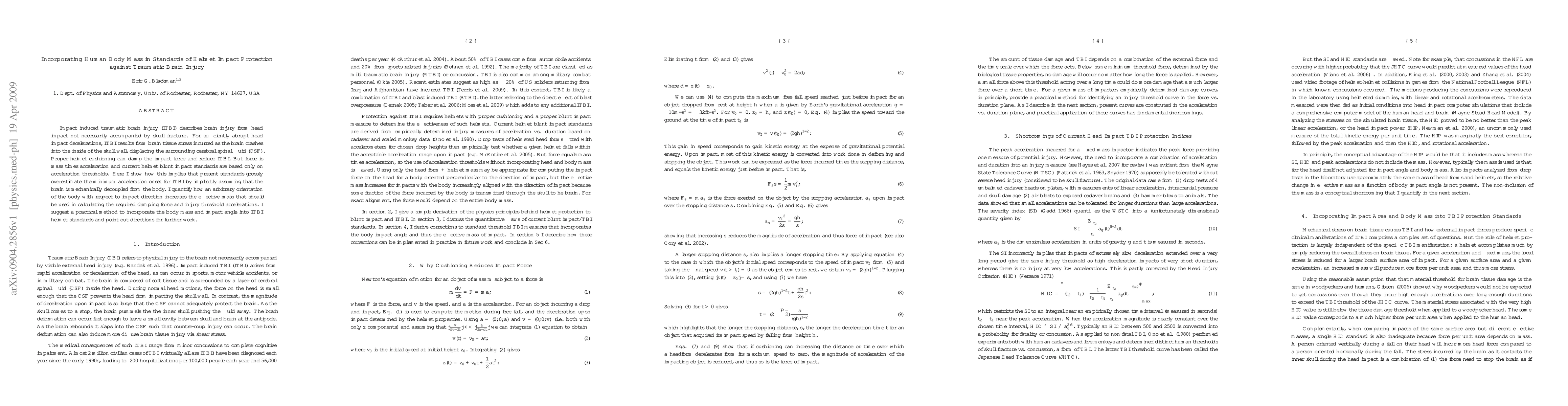 This paper discusses how current helmet standards for protecting against traumatic brain injury from impact are insufficient because they do not account for the human body mass and impact angle. It proposes a method to integrate body mass and orientation to better estimate the required helmet cushioning and injury threshold accelerations.