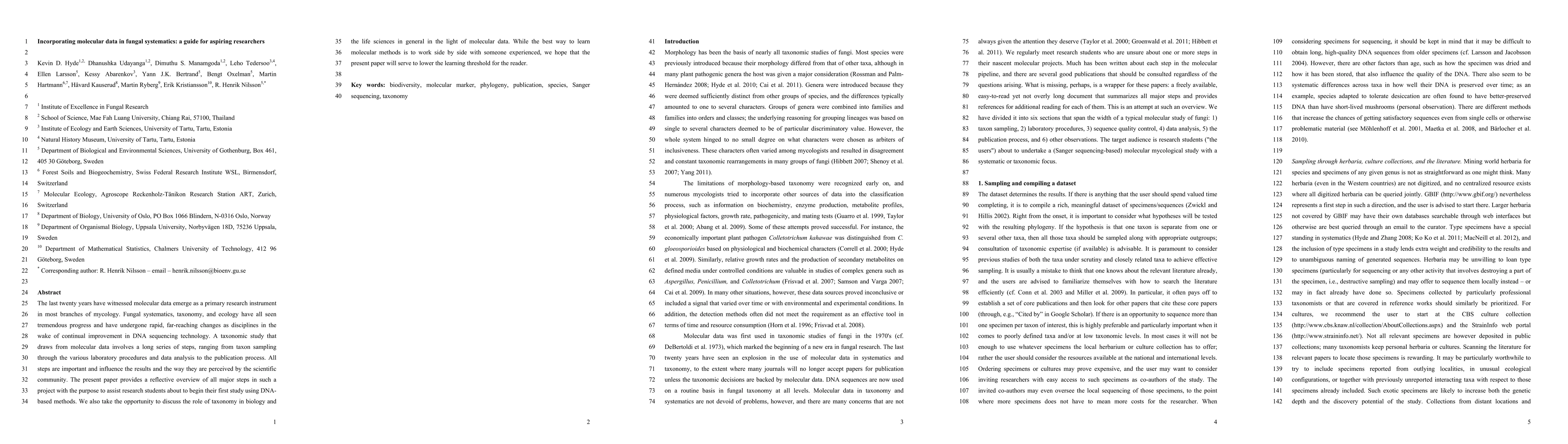 The last twenty years have witnessed molecular data emerge as a primary research instrument in most branches of mycology. Fungal systematics, taxonomy, and ecology have all seen tremendous progress and have undergone rapid, far-reaching changes as disciplines in the wake of continual improvement in DNA sequencing technology. A taxonomic study that draws from molecular data involves a long series of steps, ranging from taxon sampling through the various laboratory procedures and data analysis to the publication process. All steps are important and influence the results and the way they are perceived by the scientific community. The present paper provides a reflective overview of all major steps in such a project with the purpose to assist research students about to begin their first study using DNA-based methods. We also take the opportunity to discuss the role of taxonomy in biology and the life sciences in general in the light of molecular data. While the best way to learn molecular methods is to work side by side with someone experienced, we hope that the present paper will serve to lower the learning threshold for the reader.