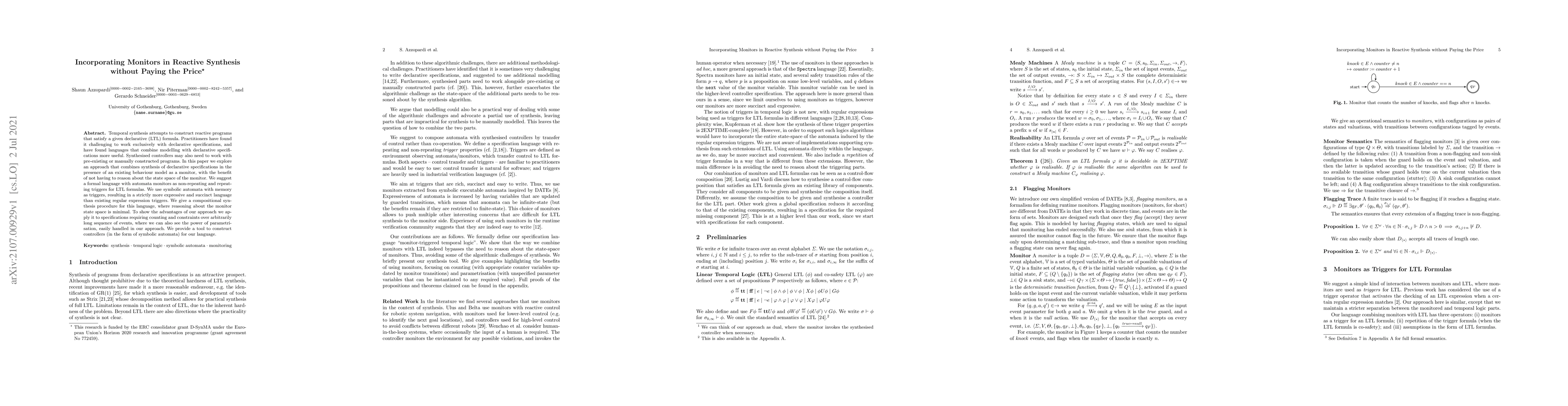 Temporal synthesis attempts to construct reactive programs that satisfy a given declarative (LTL) formula. Practitioners have found it challenging to work exclusively with declarative specifications, and have found languages that combine modelling with declarative specifications more useful. Synthesised controllers may also need to work with pre-existing or manually constructed programs. In this paper we explore an approach that combines synthesis of declarative specifications in the presence of an existing behaviour model as a monitor, with the benefit of not having to reason about the state space of the monitor. We suggest a formal language with automata monitors as non-repeating and repeating triggers for LTL formulas. We use symbolic automata with memory as triggers, resulting in a strictly more expressive and succinct language than existing regular expression triggers. We give a compositional synthesis procedure for this language, where reasoning about the monitor state space is minimal. To show the advantages of our approach we apply it to specifications requiring counting and constraints over arbitrarily long sequence of events, where we can also see the power of parametrisation, easily handled in our approach. We provide a tool to construct controllers (in the form of symbolic automata) for our language.