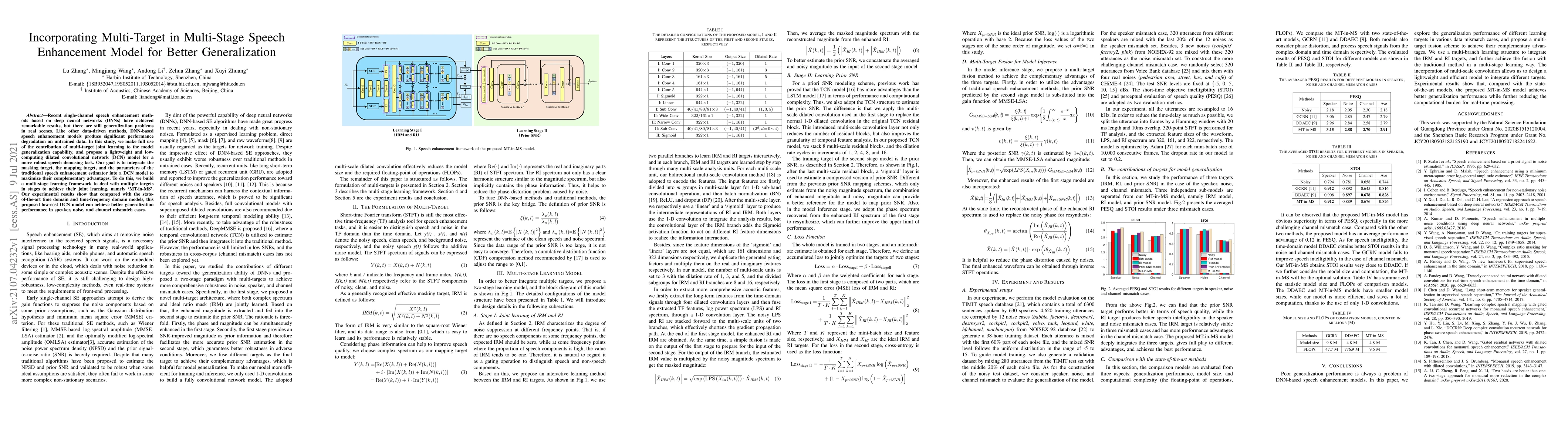 This paper proposes a multi-target, multi-stage deep convolutional network (DCN) model for enhanced speech enhancement, integrating masking, mapping targets, and traditional estimator parameters to improve generalization. The `MT-in-MS' framework achieves better performance across speaker, noise, and channel mismatch scenarios compared to state-of-the-art models.