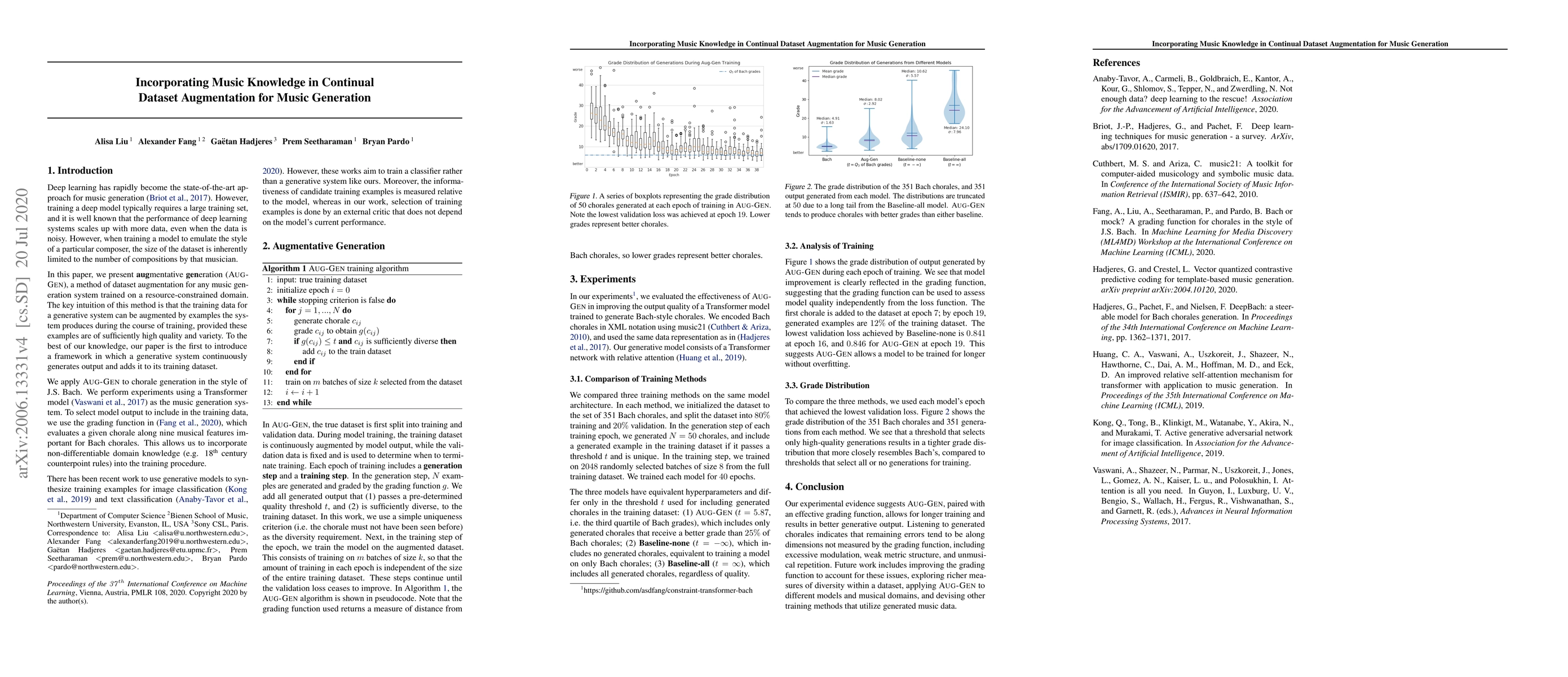 This paper introduces Aug-Gen, a method for continual dataset augmentation in music generation, which enhances training data with high-quality, diverse examples generated during training. Applied to Transformer-based chorale generation in Bach's style, Aug-Gen enables longer training periods and produces superior generative outputs.