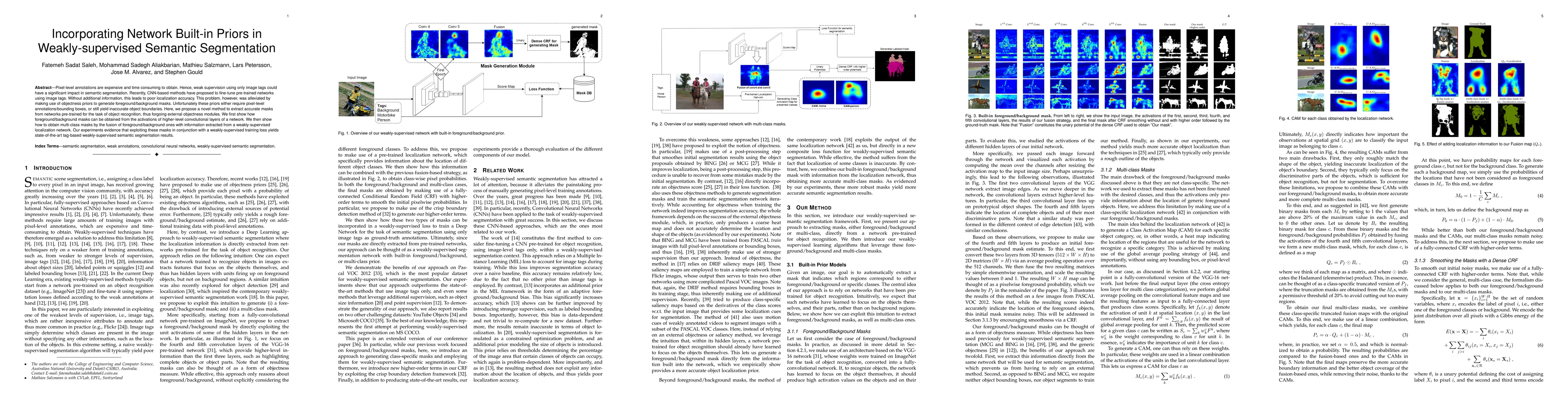 This paper proposes a novel method for weakly-supervised semantic segmentation using network built-in priors to generate accurate foreground/background masks from pre-trained object recognition networks, achieving state-of-the-art results without requiring pixel-level annotations. The method fuses these masks with localization network information for multi-class segmentation.