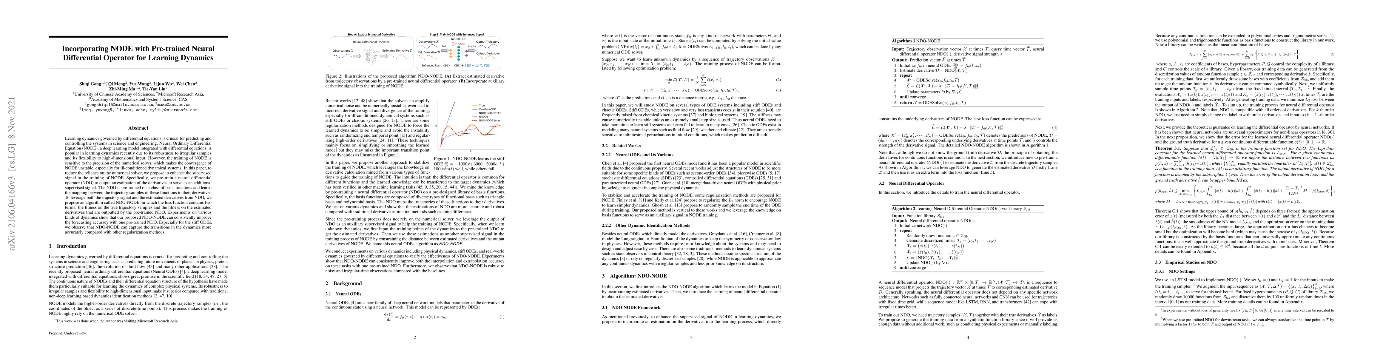 Learning dynamics governed by differential equations is crucial for predicting and controlling the systems in science and engineering. Neural Ordinary Differential Equation (NODE), a deep learning model integrated with differential equations, is popular in learning dynamics recently due to its robustness to irregular samples and its flexibility to high-dimensional input. However, the training of NODE is sensitive to the precision of the numerical solver, which makes the convergence of NODE unstable, especially for ill-conditioned dynamical systems. In this paper, to reduce the reliance on the numerical solver, we propose to enhance the supervised signal in the training of NODE. Specifically, we pre-train a neural differential operator (NDO) to output an estimation of the derivatives to serve as an additional supervised signal. The NDO is pre-trained on a class of basis functions and learns the mapping between the trajectory samples of these functions to their derivatives. To leverage both the trajectory signal and the estimated derivatives from NDO, we propose an algorithm called NDO-NODE, in which the loss function contains two terms: the fitness on the true trajectory samples and the fitness on the estimated derivatives that are outputted by the pre-trained NDO. Experiments on various kinds of dynamics show that our proposed NDO-NODE can consistently improve the forecasting accuracy with one pre-trained NDO. Especially for the stiff ODEs, we observe that NDO-NODE can capture the transitions in the dynamics more accurately compared with other regularization methods.