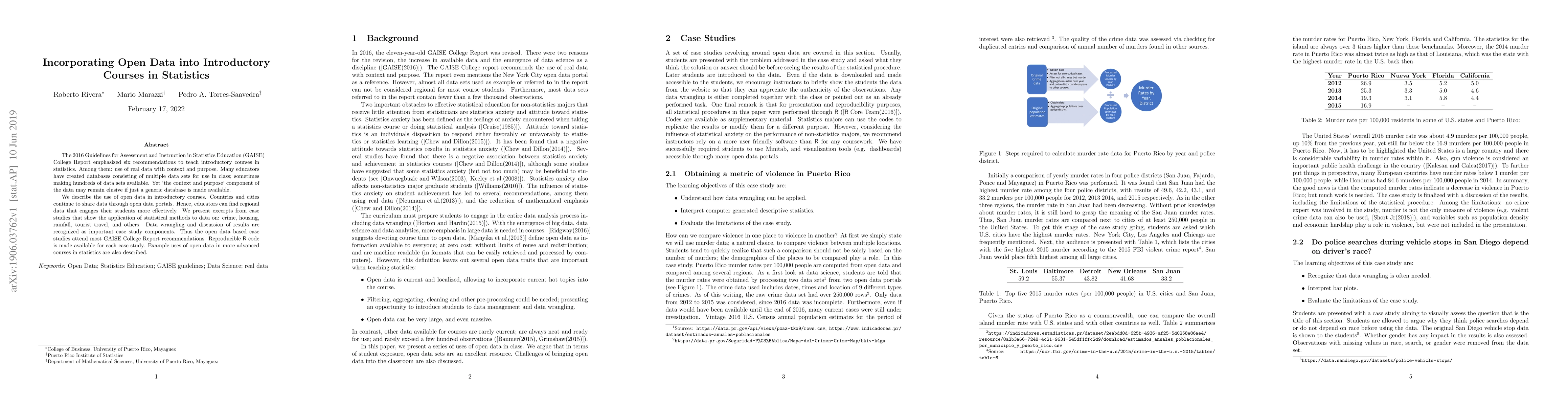 This paper discusses the integration of open data into introductory statistics courses, emphasizing the use of regional data to enhance student engagement and contextual understanding. It highlights case studies involving real-world data on crime, housing, and tourism, and provides reproducible R code to facilitate data analysis and discussion.