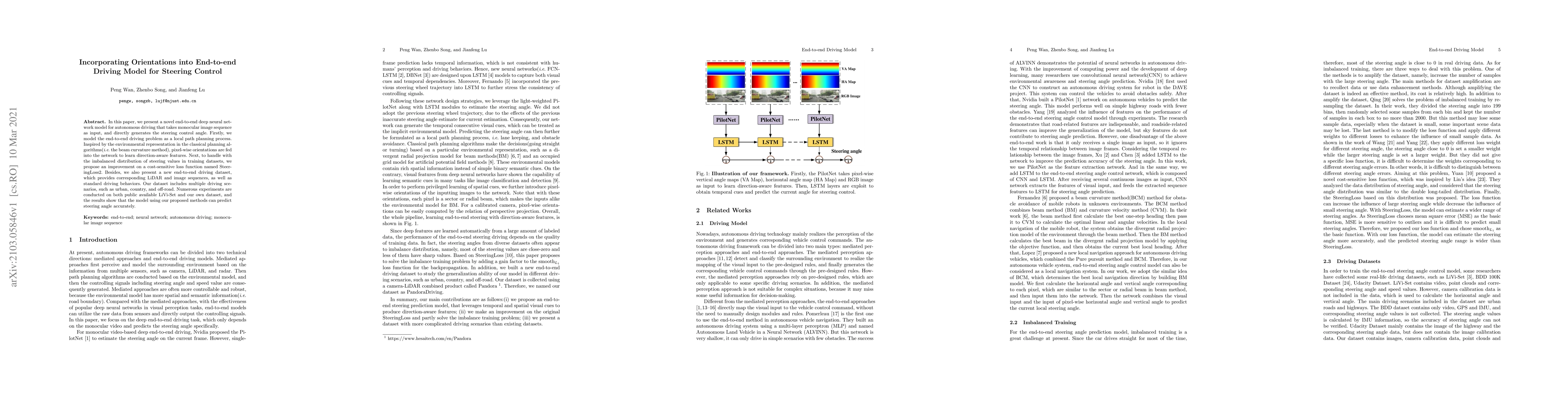 In this paper, we present a novel end-to-end deep neural network model for autonomous driving that takes monocular image sequence as input, and directly generates the steering control angle. Firstly, we model the end-to-end driving problem as a local path planning process. Inspired by the environmental representation in the classical planning algorithms(i.e. the beam curvature method), pixel-wise orientations are fed into the network to learn direction-aware features. Next, to handle the imbalanced distribution of steering values in training datasets, we propose an improvement on a cost-sensitive loss function named SteeringLoss2. Besides, we also present a new end-to-end driving dataset, which provides corresponding LiDAR and image sequences, as well as standard driving behaviors. Our dataset includes multiple driving scenarios, such as urban, country, and off-road. Numerous experiments are conducted on both public available LiVi-Set and our own dataset, and the results show that the model using our proposed methods can predict steering angle accurately.