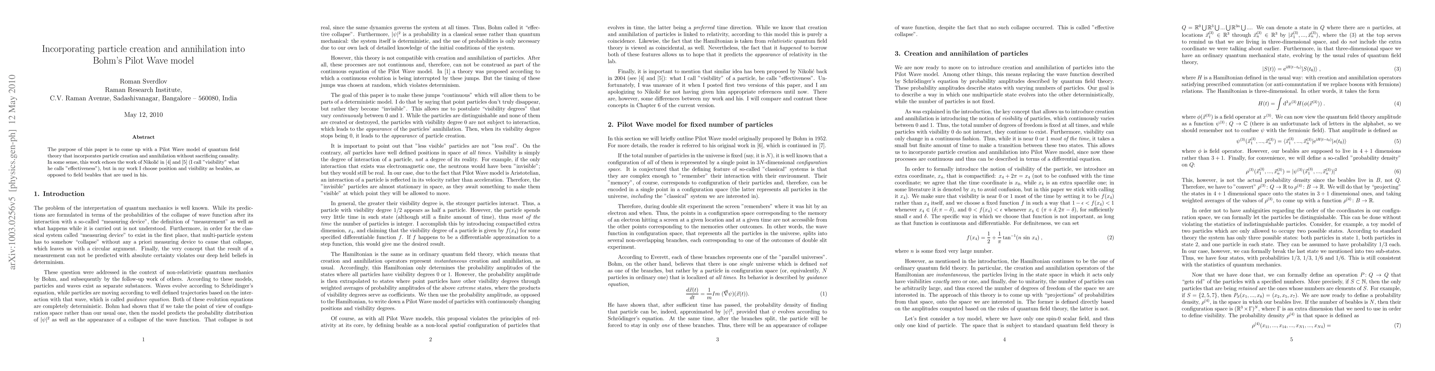This paper develops a Pilot Wave model for quantum field theory that includes particle creation and annihilation while maintaining causality, using position and visibility as fundamental properties instead of field beables. This approach parallels but diverges from Nikolić's work by focusing on different beables.
