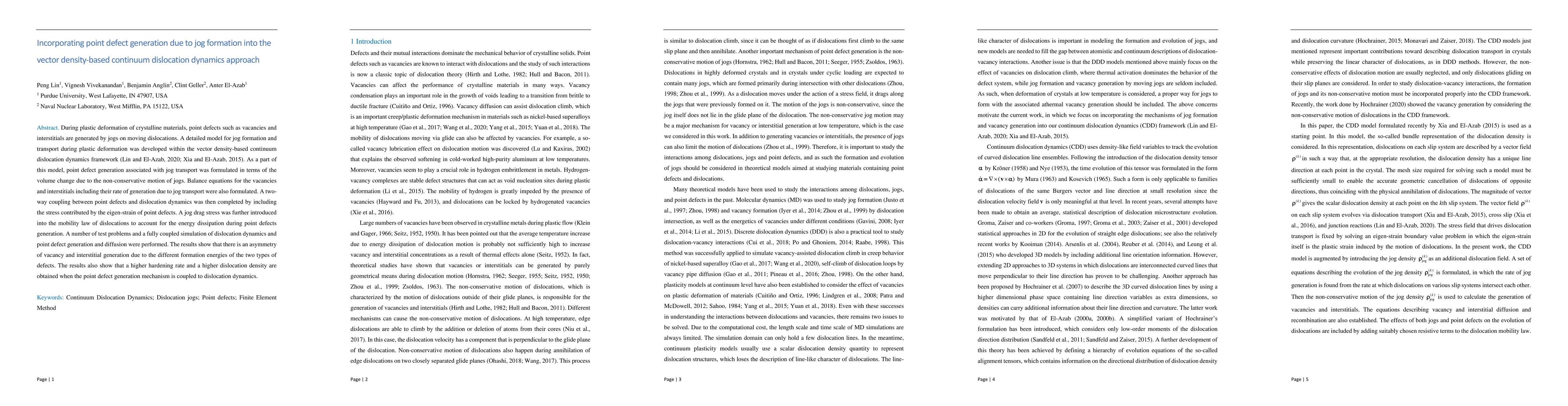 This paper develops a detailed model for point defect generation due to jog formation during plastic deformation within a vector density-based continuum dislocation dynamics framework. The model includes balance equations for vacancies and interstitials, a two-way coupling between point defects and dislocation dynamics, and a jog drag stress to account for energy dissipation, showing an asymmetry in defect generation and enhanced hardening.