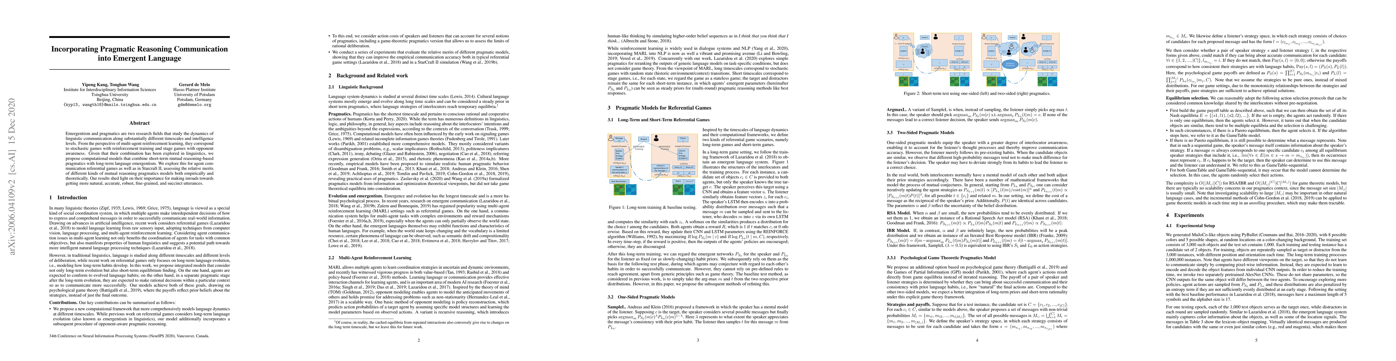 Emergentism and pragmatics are two research fields that study the dynamics of linguistic communication along substantially different timescales and intelligence levels. From the perspective of multi-agent reinforcement learning, they correspond to stochastic games with reinforcement training and stage games with opponent awareness. Given that their combination has been explored in linguistics, we propose computational models that combine short-term mutual reasoning-based pragmatics with long-term language emergentism. We explore this for agent communication referential games as well as in Starcraft II, assessing the relative merits of different kinds of mutual reasoning pragmatics models both empirically and theoretically. Our results shed light on their importance for making inroads towards getting more natural, accurate, robust, fine-grained, and succinct utterances.