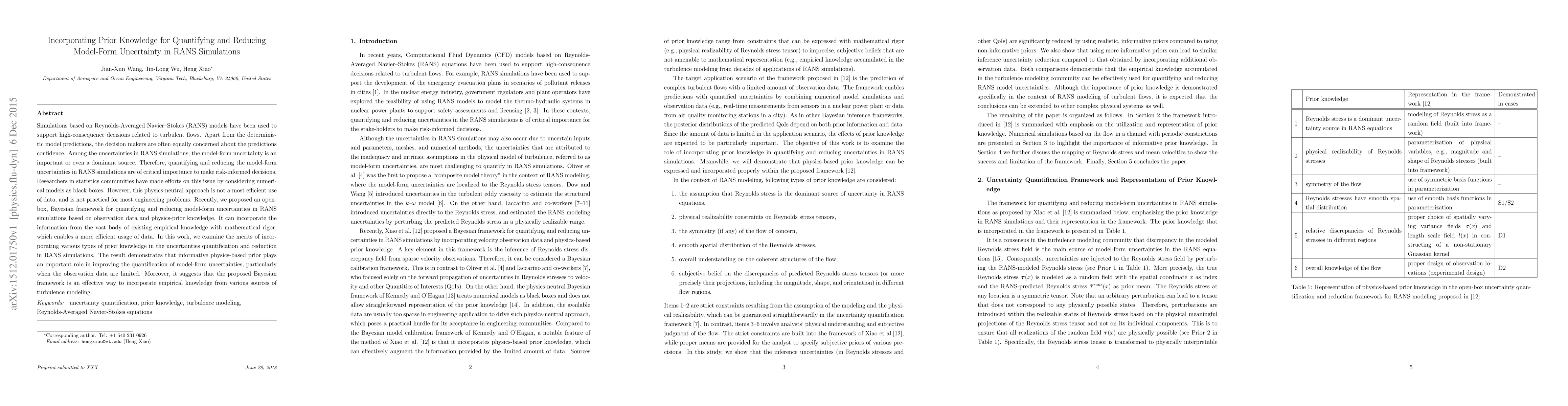 This paper proposes a Bayesian framework for quantifying and reducing model-form uncertainties in RANS simulations by incorporating prior knowledge and observation data. The study demonstrates that informative physics-based priors significantly improve uncertainty quantification, especially with limited data, and validates the effectiveness of the framework in integrating empirical knowledge.