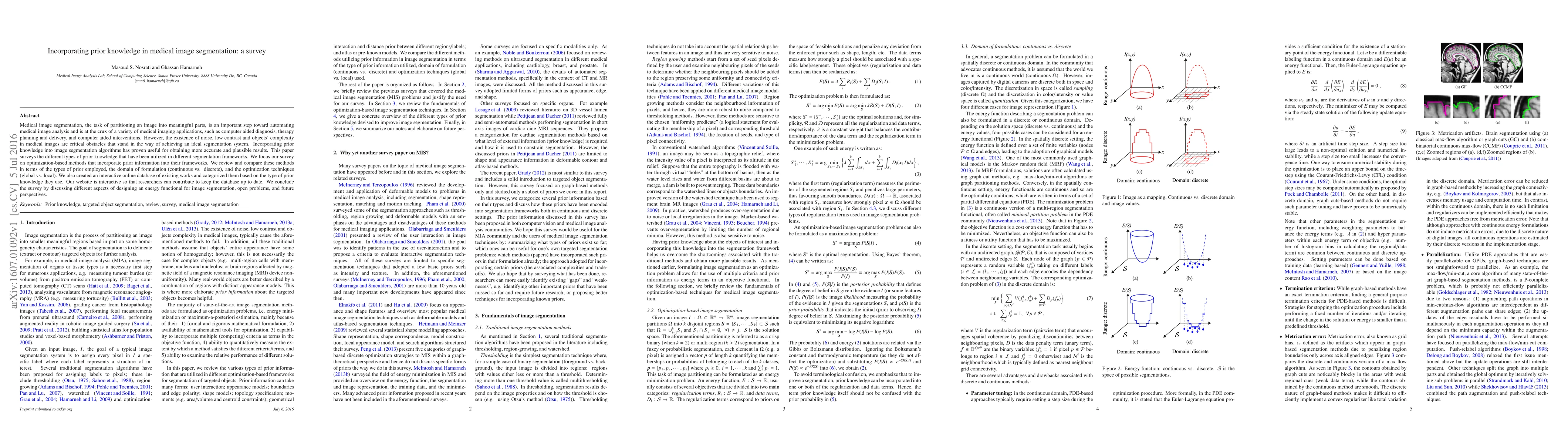This paper surveys optimization-based methods for medical image segmentation that incorporate prior knowledge to improve accuracy. It categorizes and compares these methods based on the type of prior knowledge, domain formulation, and optimization techniques, and provides an interactive online database for researchers to contribute and stay updated.