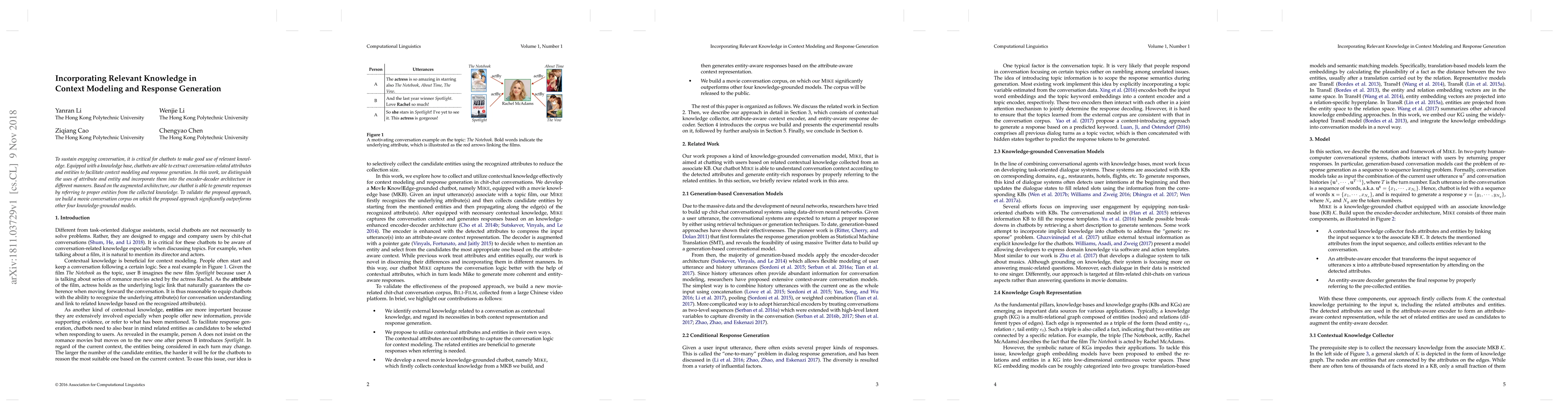 This research introduces a method to enhance chatbots' ability to generate relevant responses by incorporating attributes and entities from a knowledge base into context modeling. The proposed encoder-decoder architecture, used in the chatbot Mike, significantly outperforms other models in generating contextually appropriate movie-related conversation responses.