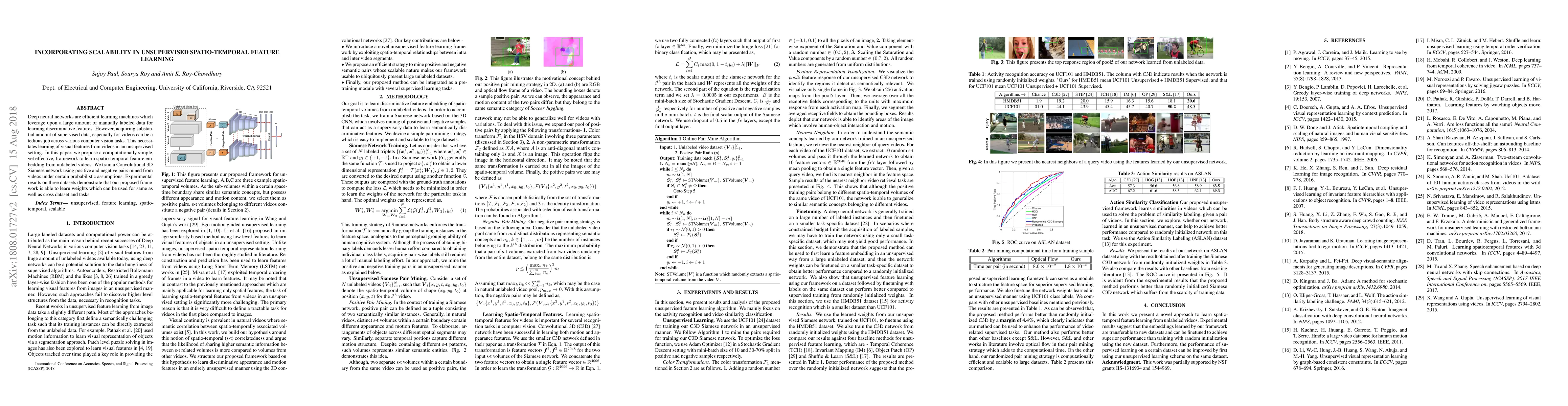This paper proposes a framework for learning spatio-temporal feature embeddings from unlabeled videos using a Convolutional 3D Siamese network. The proposed method demonstrates effective feature learning across different datasets and tasks.