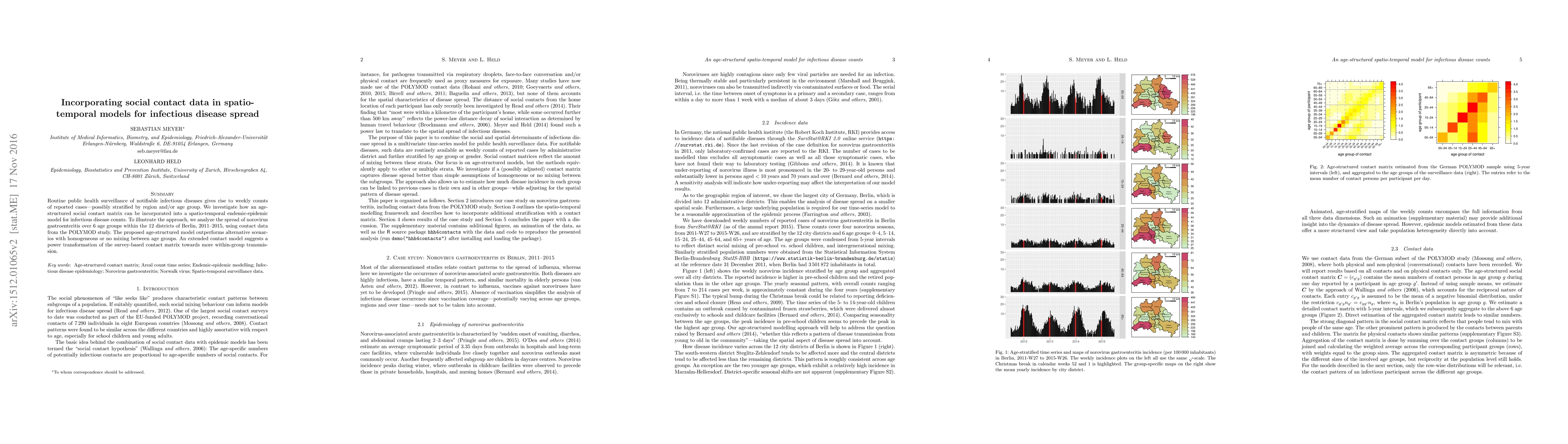 Routine public health surveillance of notifiable infectious diseases gives rise to weekly counts of reported cases -- possibly stratified by region and/or age group. We investigate how an age-structured social contact matrix can be incorporated into a spatio-temporal endemic-epidemic model for infectious disease counts. To illustrate the approach, we analyze the spread of norovirus gastroenteritis over 6 age groups within the 12 districts of Berlin, 2011-2015, using contact data from the POLYMOD study. The proposed age-structured model outperforms alternative scenarios with homogeneous or no mixing between age groups. An extended contact model suggests a power transformation of the survey-based contact matrix towards more within-group transmission.