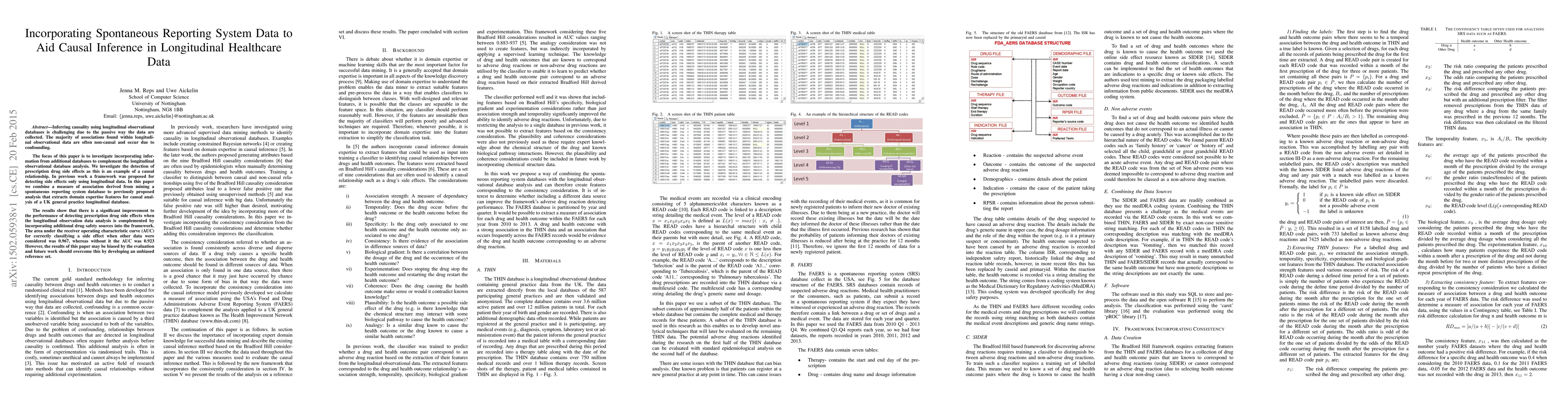 This paper explores enhancing causal inference in longitudinal healthcare data by integrating spontaneous reporting system data. Combining this with domain expertise features significantly improves the detection of prescription drug side effects, raising the AUC from 0.923 to 0.967. However, future work should aim to develop an unbiased reference set to mitigate potential bias.