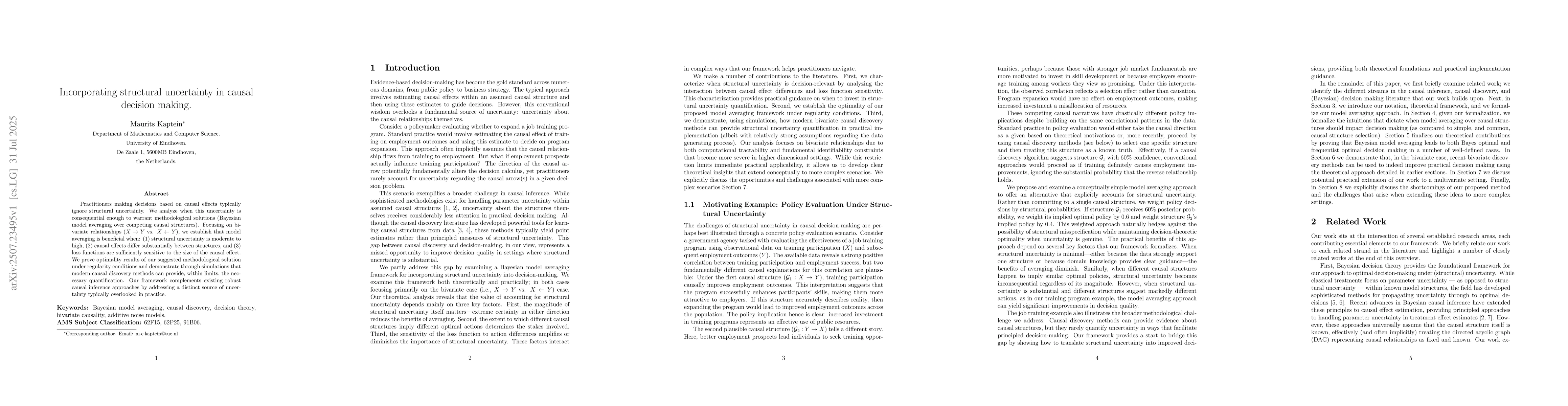 Practitioners making decisions based on causal effects typically ignore structural uncertainty. We analyze when this uncertainty is consequential enough to warrant methodological solutions (Bayesian model averaging over competing causal structures). Focusing on bivariate relationships ($X \rightarrow Y$ vs. $X \leftarrow Y$), we establish that model averaging is beneficial when: (1) structural uncertainty is moderate to high, (2) causal effects differ substantially between structures, and (3) loss functions are sufficiently sensitive to the size of the causal effect. We prove optimality results of our suggested methodological solution under regularity conditions and demonstrate through simulations that modern causal discovery methods can provide, within limits, the necessary quantification. Our framework complements existing robust causal inference approaches by addressing a distinct source of uncertainty typically overlooked in practice.